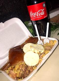 Arroz, carne de lechona, arveja, cuero, arepa