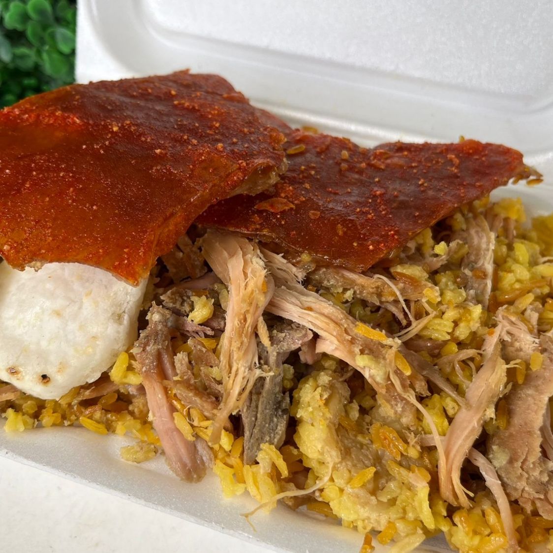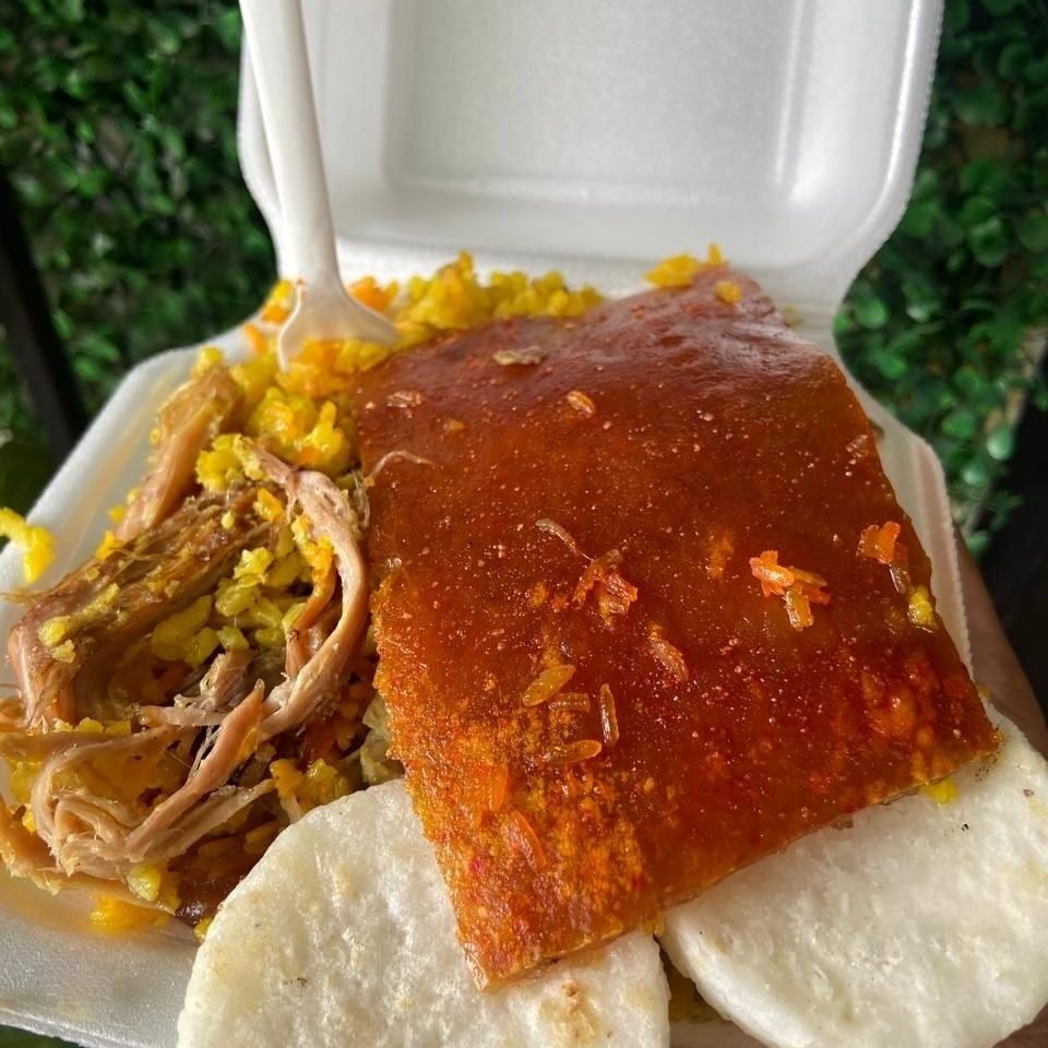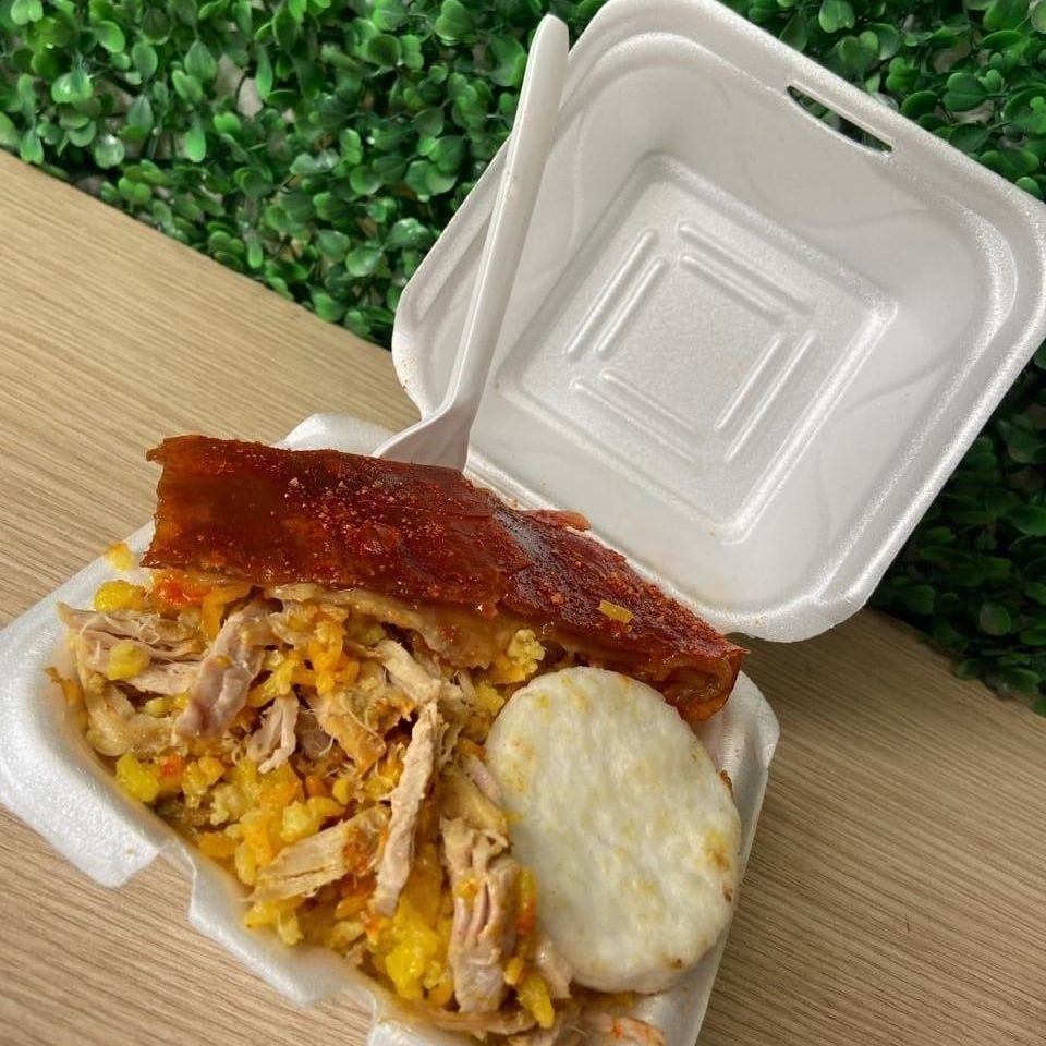 Arroz, carne de lechona, arveja, cuero y arepa