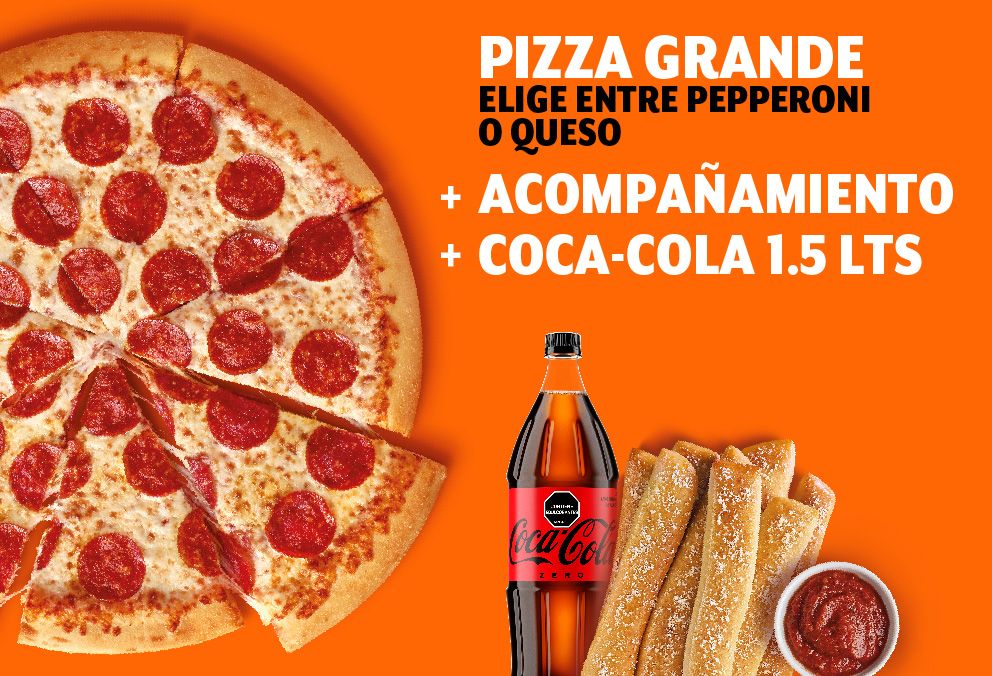 Pizza grande 8 porciones de pepperoni o queso, acompañamiento a elección entre Crazy Combo o Crazy Puffs (4 unidades de pepperoni, 4 quesos y tocineta o bocadillo) y Bebida 1.5 Lt a elección.