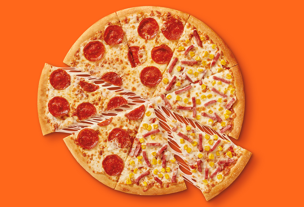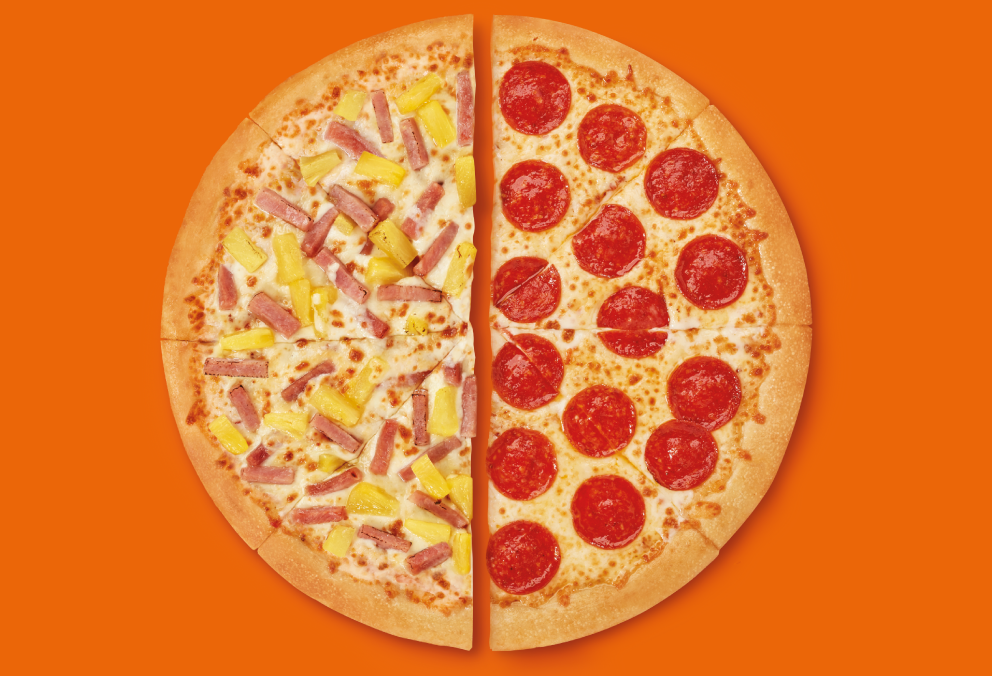 Pizza grande de 8 porciones con base de salsa de tomates y queso, la combinación perfecta en una pizza: mitad Hula Hawaiian y mitad Pepperoni. No se puede personalizar o agregar ingredientes adicionales