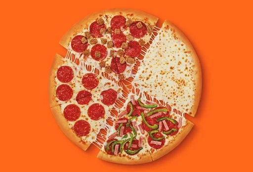 Pizza grande 8 porciones con 4 sabores diferentes, preparada con nuestra deliciosa base de salsa de tomates y queso: 2 rebanadas con pepperoni, 2 rebanadas de queso, 2 rebanadas con pepperoni y salchicha italiana, 2 rebanadas con jamón y pimentón verde. No se puede personalizar o agregar ingredientes adicionales