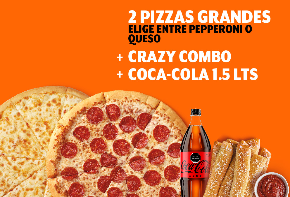 2 Pizzas grandes 8 porciones de pepperoni o queso, Crazy Bread, Crazy Sauce y Bebida 1.5 Lt a elección.