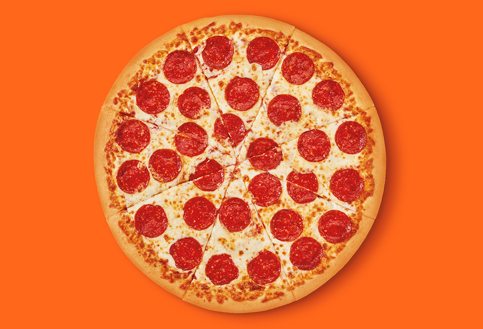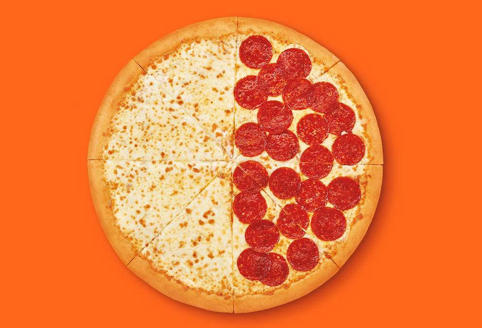 Pizza grande de 8 porciones con base de salsa de tomates mitad extra queso y mitad extra pepperoni, No se puede personalizar o agregar ingredientes adicionales.