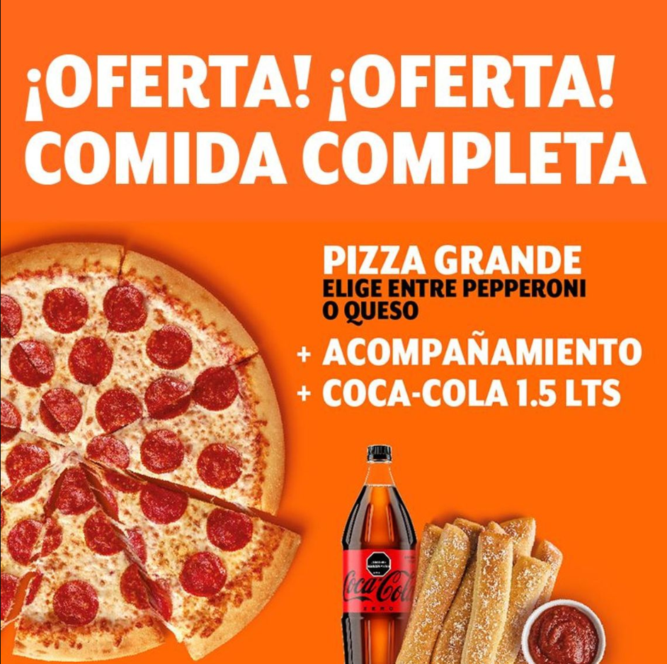Pizza grande 8 porciones de pepperoni, acompañamiento de Crazy Combo y Bebida 1.5 Lt a elección.