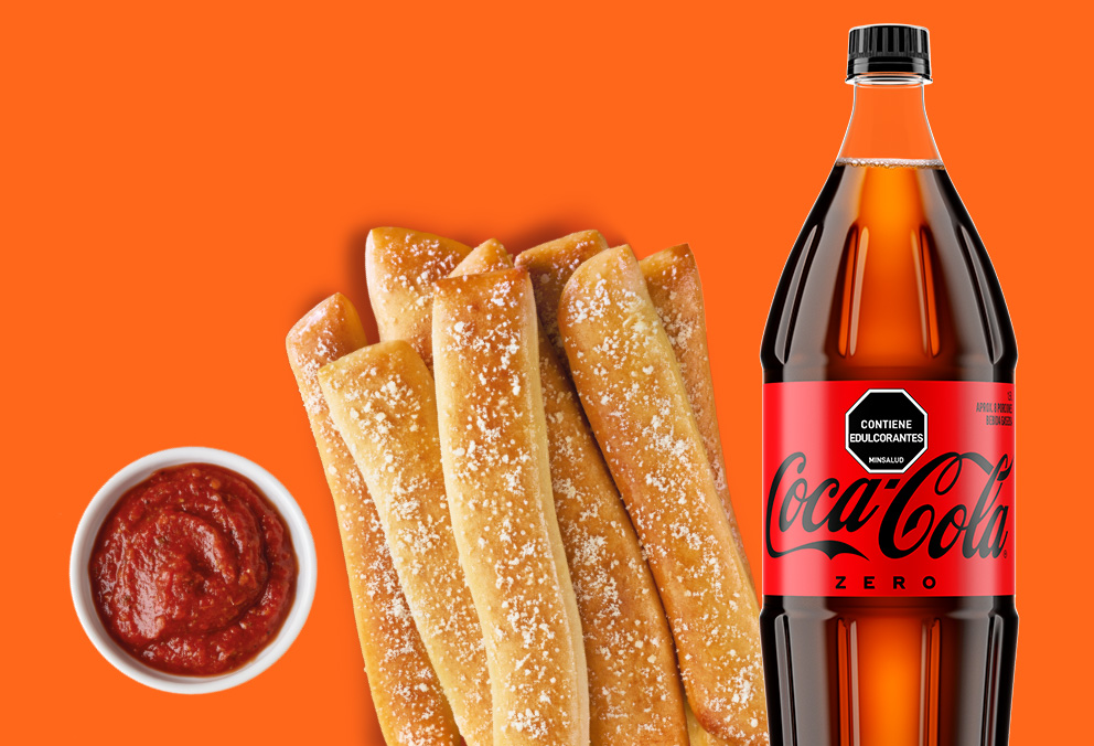 8 Palitos de pan con mantequilla de ajo y parmesano acompañado de nuestra salsa de tomates con la receta de la casa y Bebida 1.5 Lt a elección.