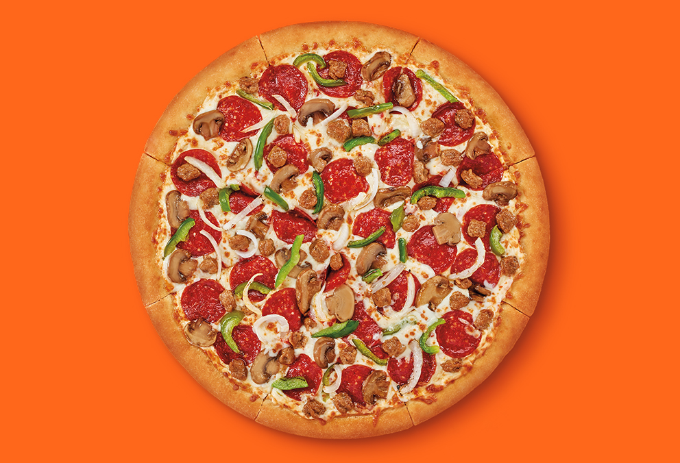 Pizza grande de 8 porciones con base de salsa de tomates y queso, pepperoni, salchicha italiana, champiñones, pimentón verde y cebolla. No se puede personalizar o agregar ingredientes adicionales.