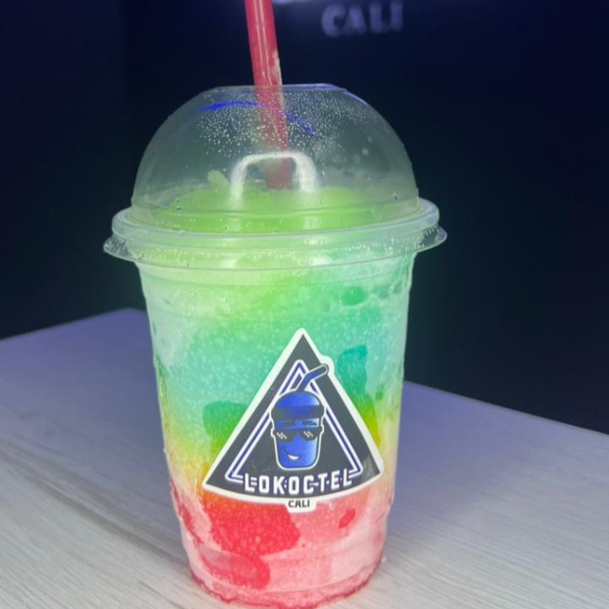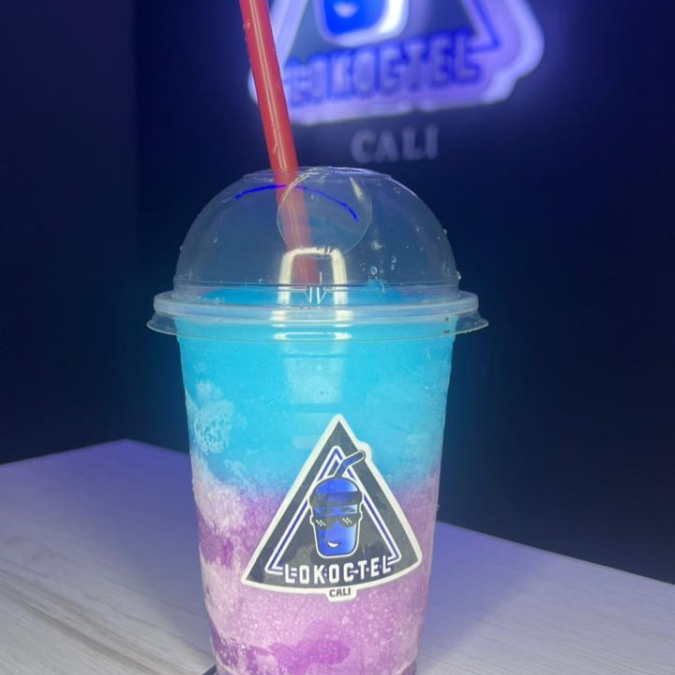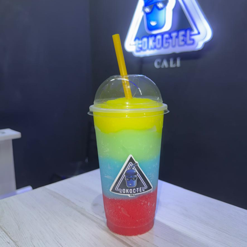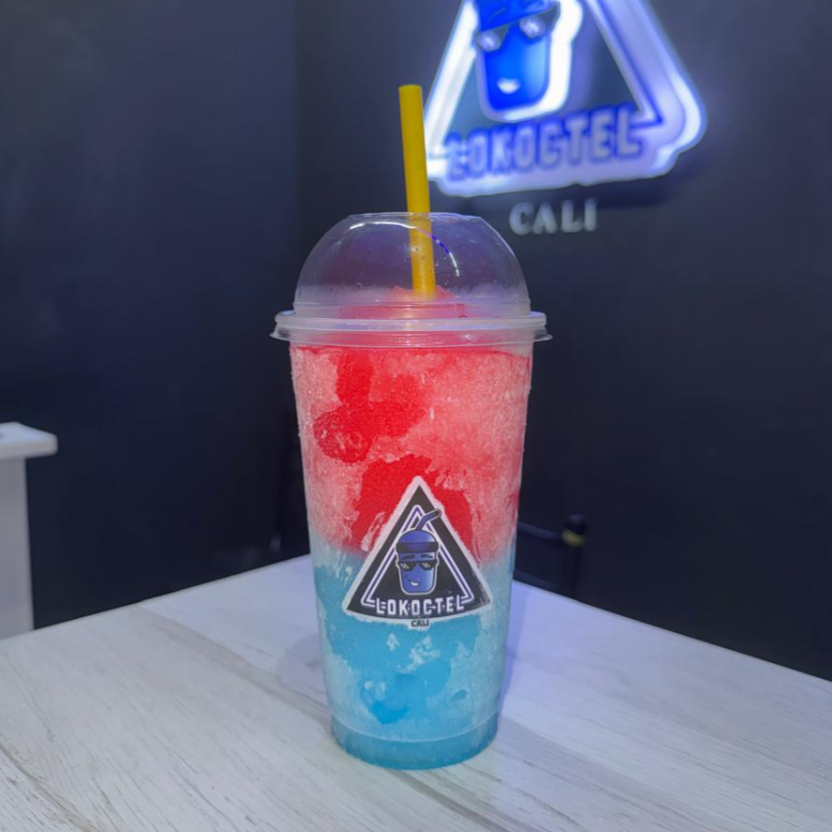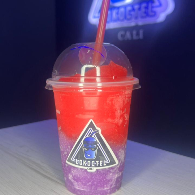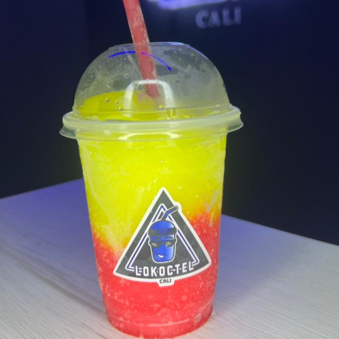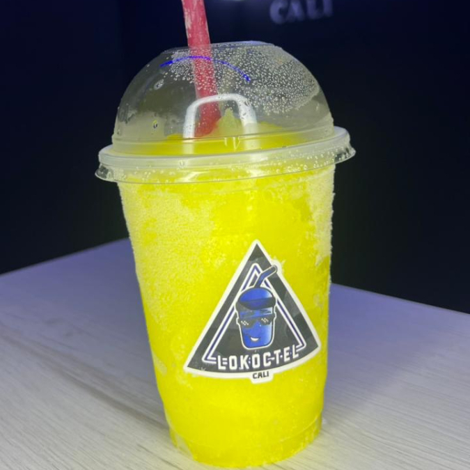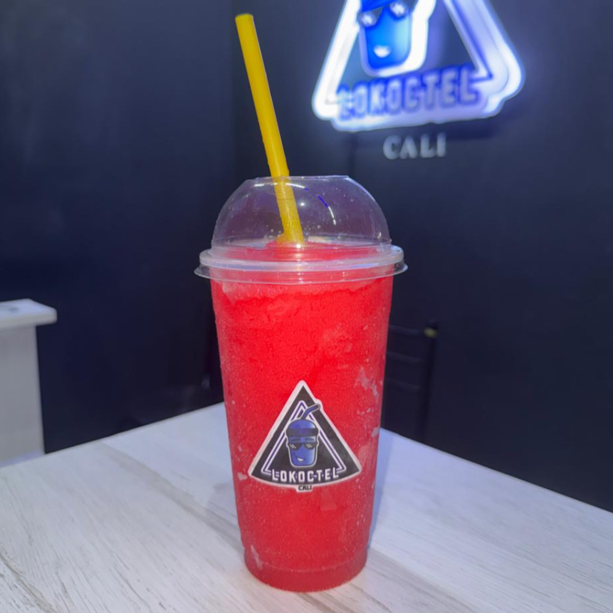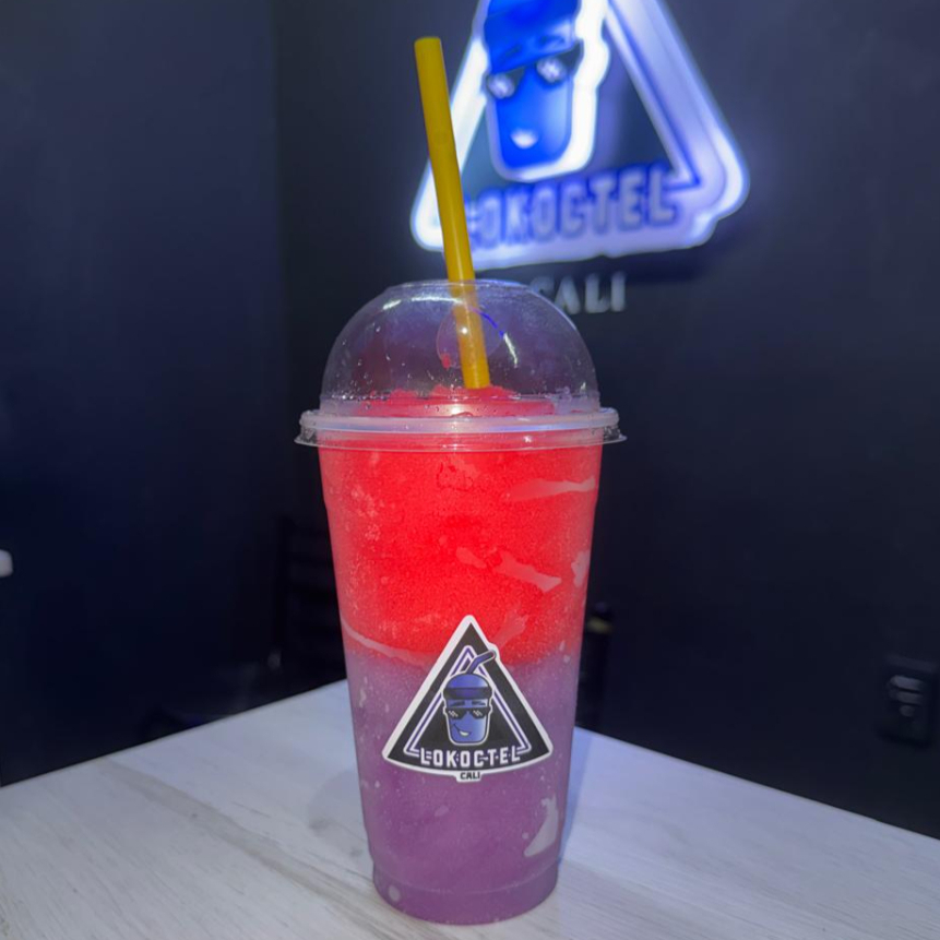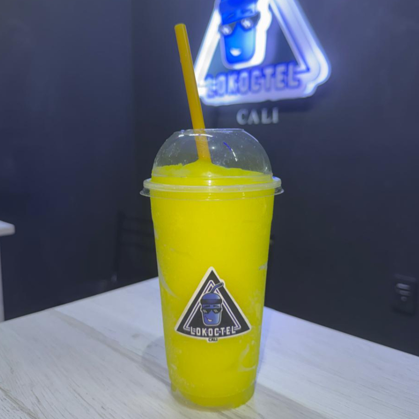 Cóctel granizado de maracuya, mango y melocoton con tequila y vodka con burbujas explosivas y topping de fresa picada. 14 oz.