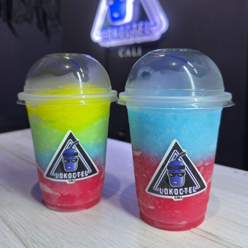 2 Cocteles granizados de 14 onzas, con topping de fresas y perlas explosivas. .