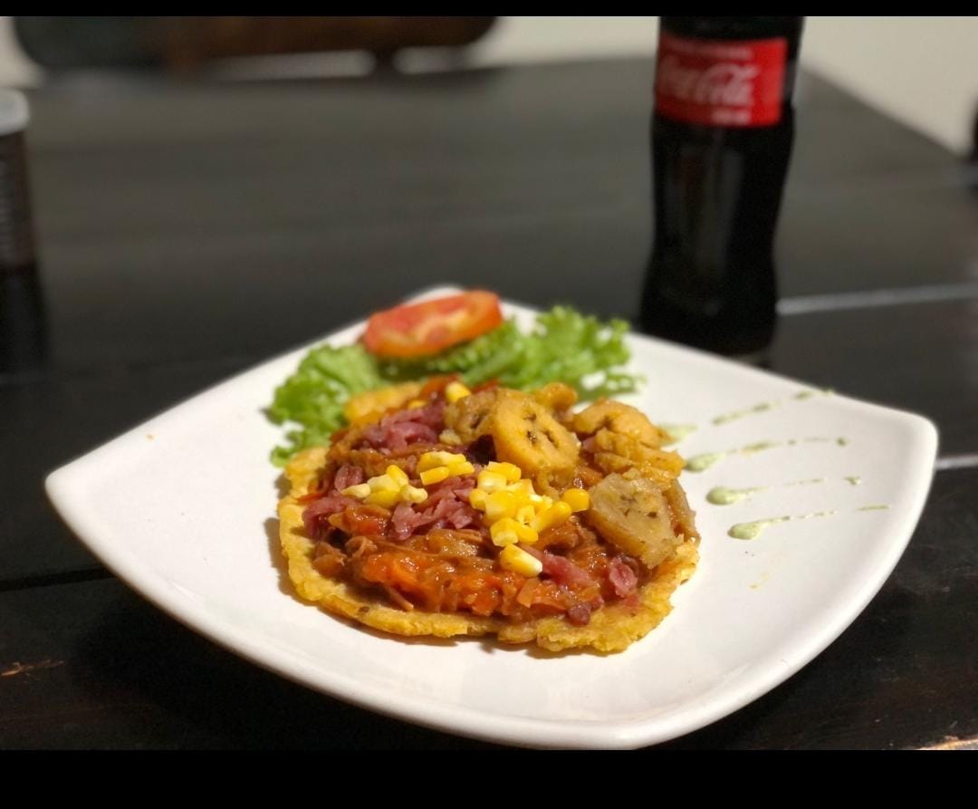 PATACON, CARNE DESMECHADA CON SALSITA CRIOLLA, MADURO, TOCINETA, , MAIZ TIERNO Y QUESO