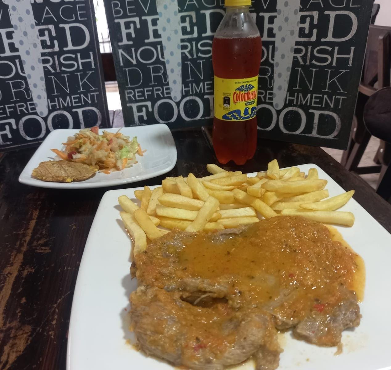 Baby beef acompañado de papa a la francesa, ensalada con vinagreta y maduro.