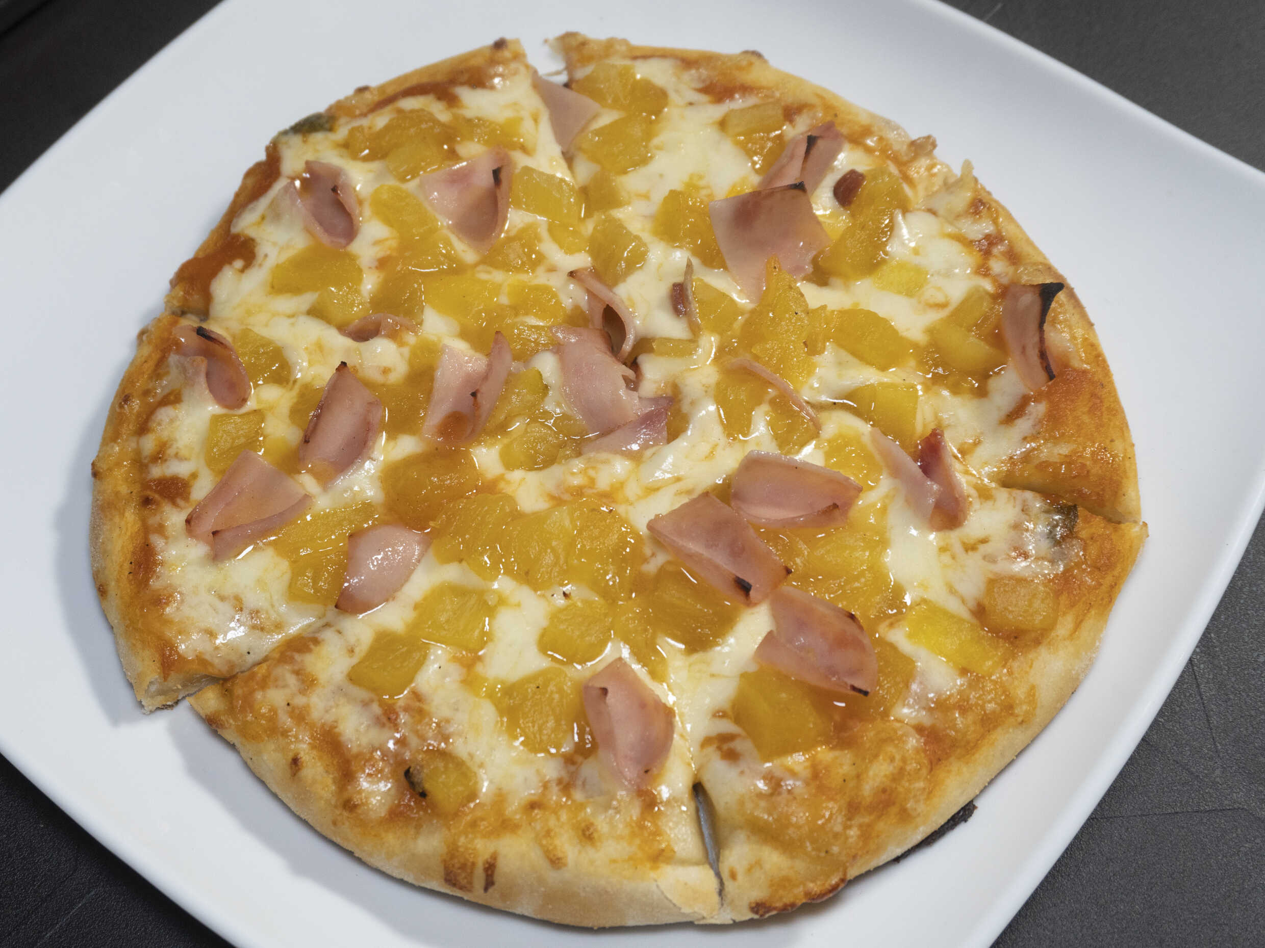 Pizza con jamón, cabano, salamí, champiñones, cebolla y pimentón, tamaño a elegir.