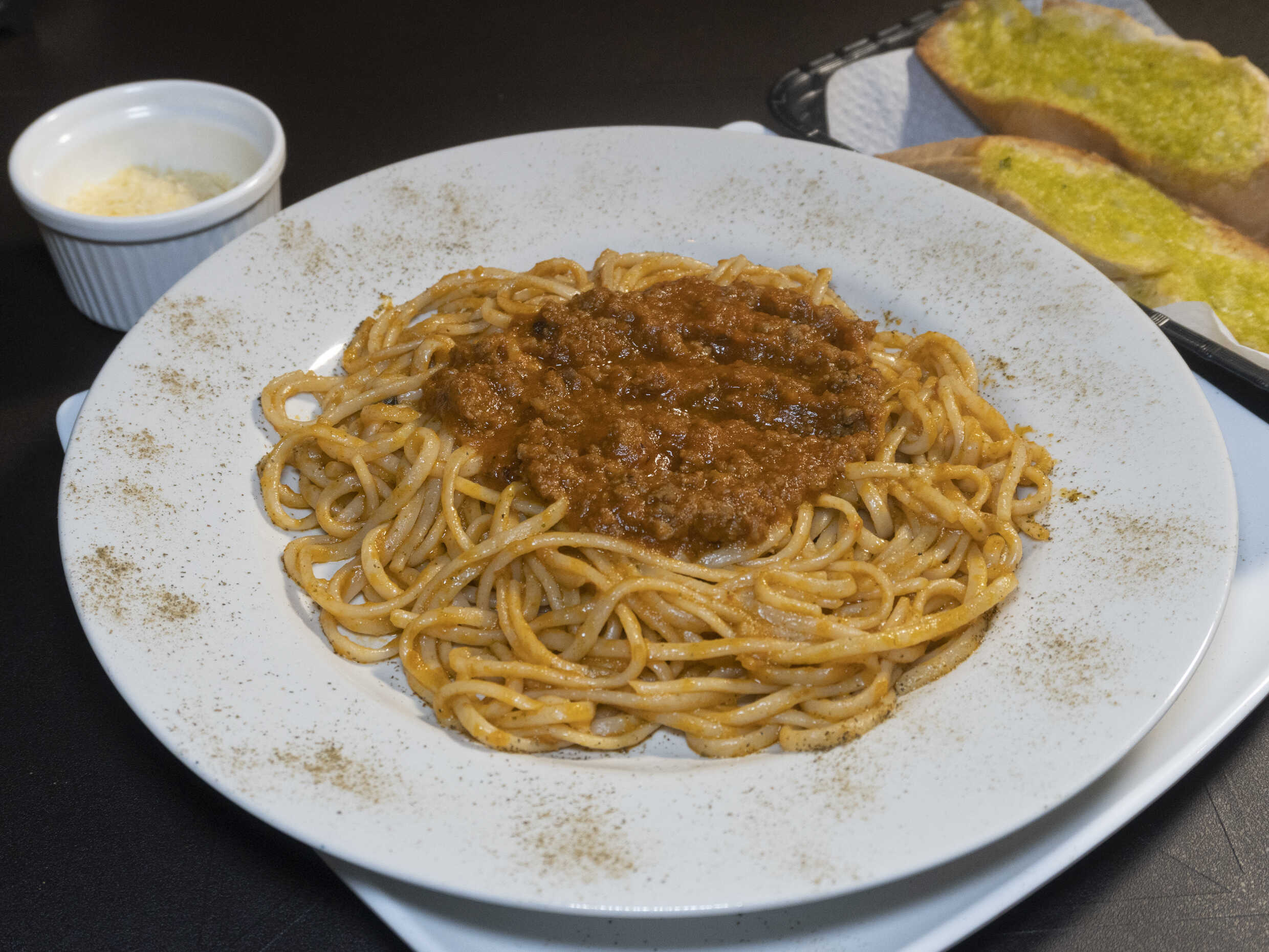 Cuatro piezas de canelones con carne boloñesa , salsa napolitana , acompañado de pan francés con ajo