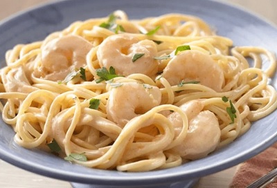 Lasaña con camarones salteados, queso mozzarella y parmesano.