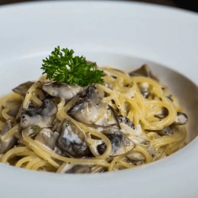Pizza con champiñones, queso azul, queso holandés, parmesano y queso mozzarella,tamaño a elegir.