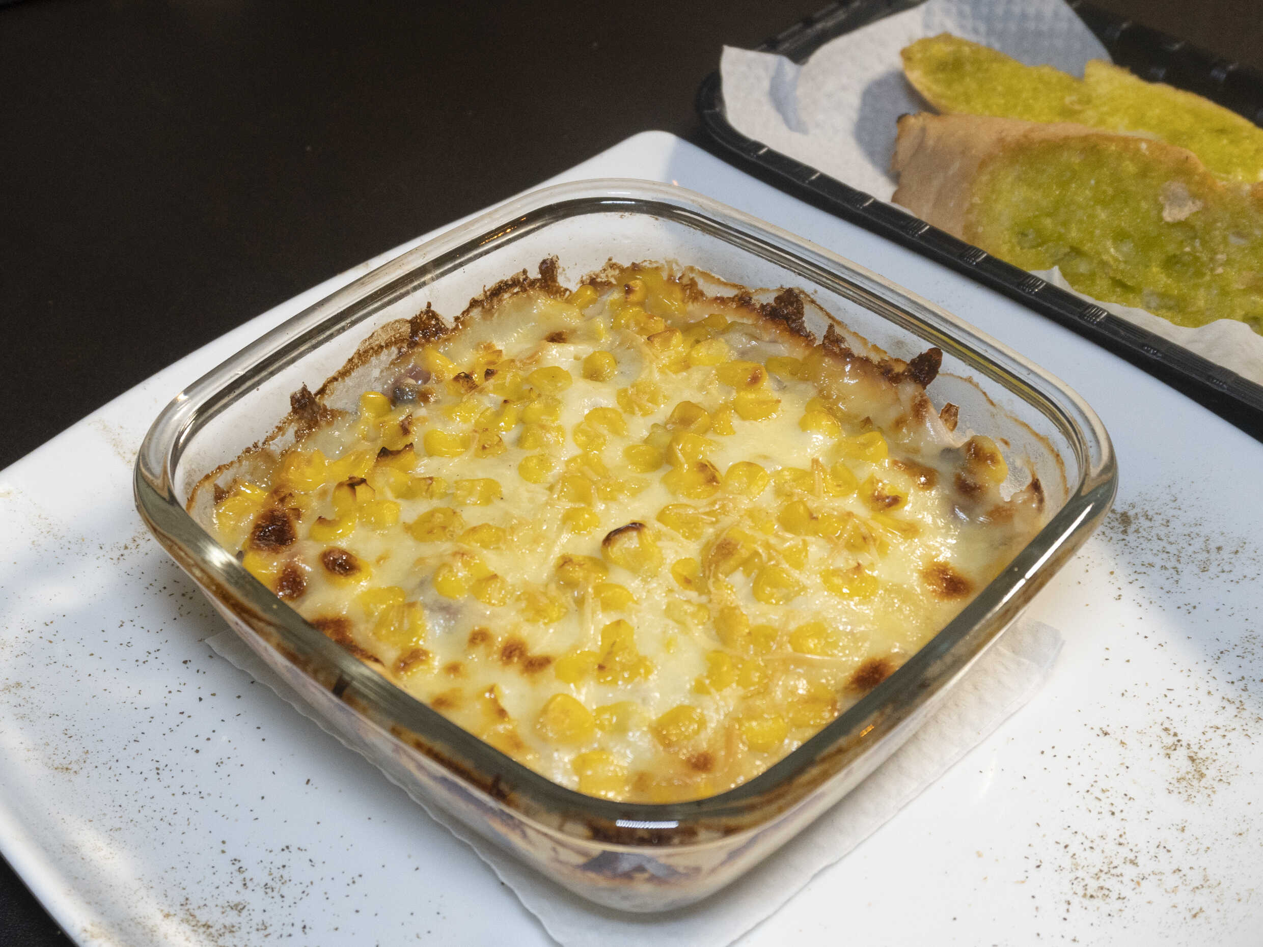 Cuatro piezas de canelones con pollo , salsa bechamel , acompañado de pan francés con ajo