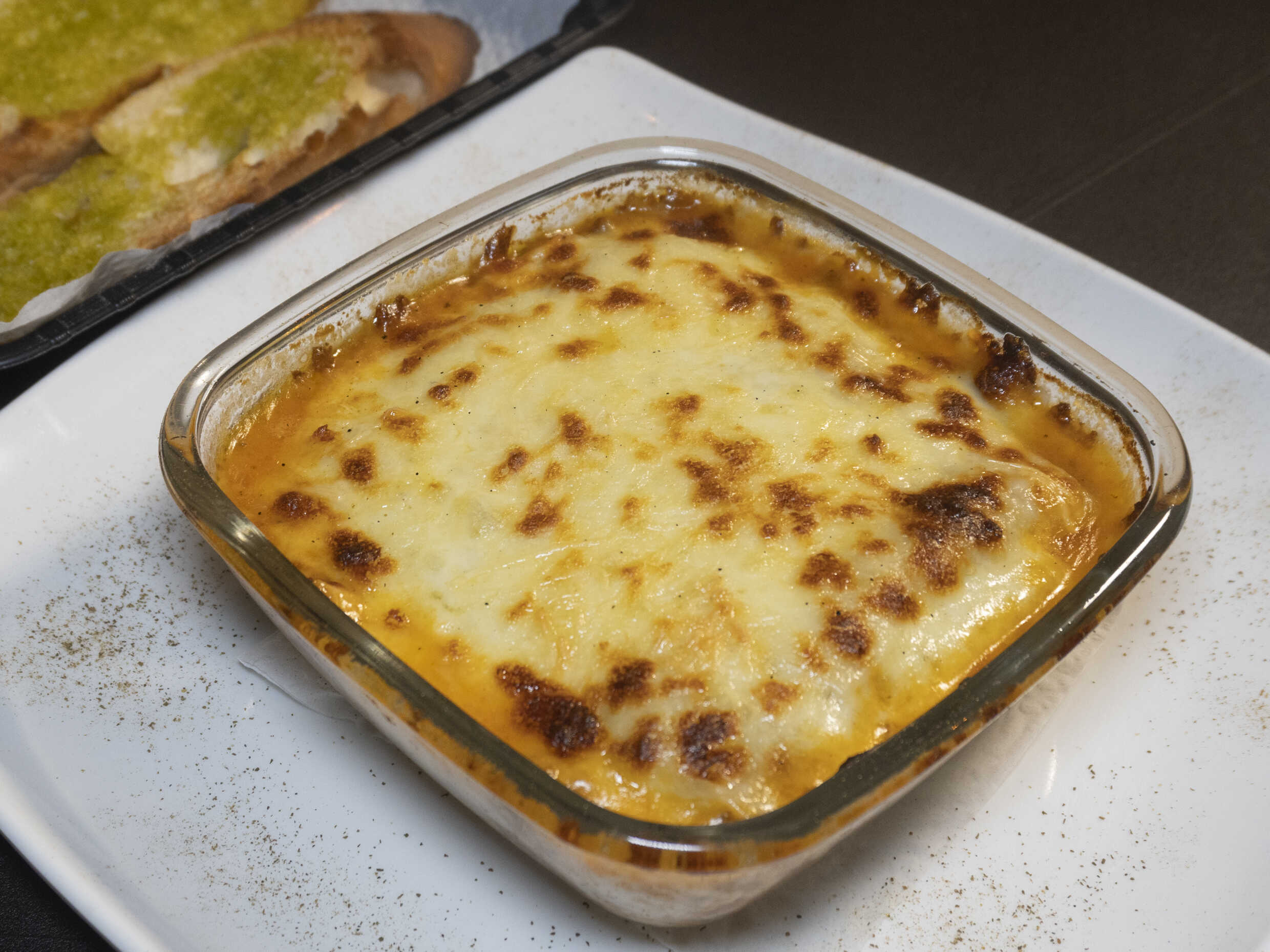 Lasaña con pollo, champiñones , queso mozzarella y parmesano.
