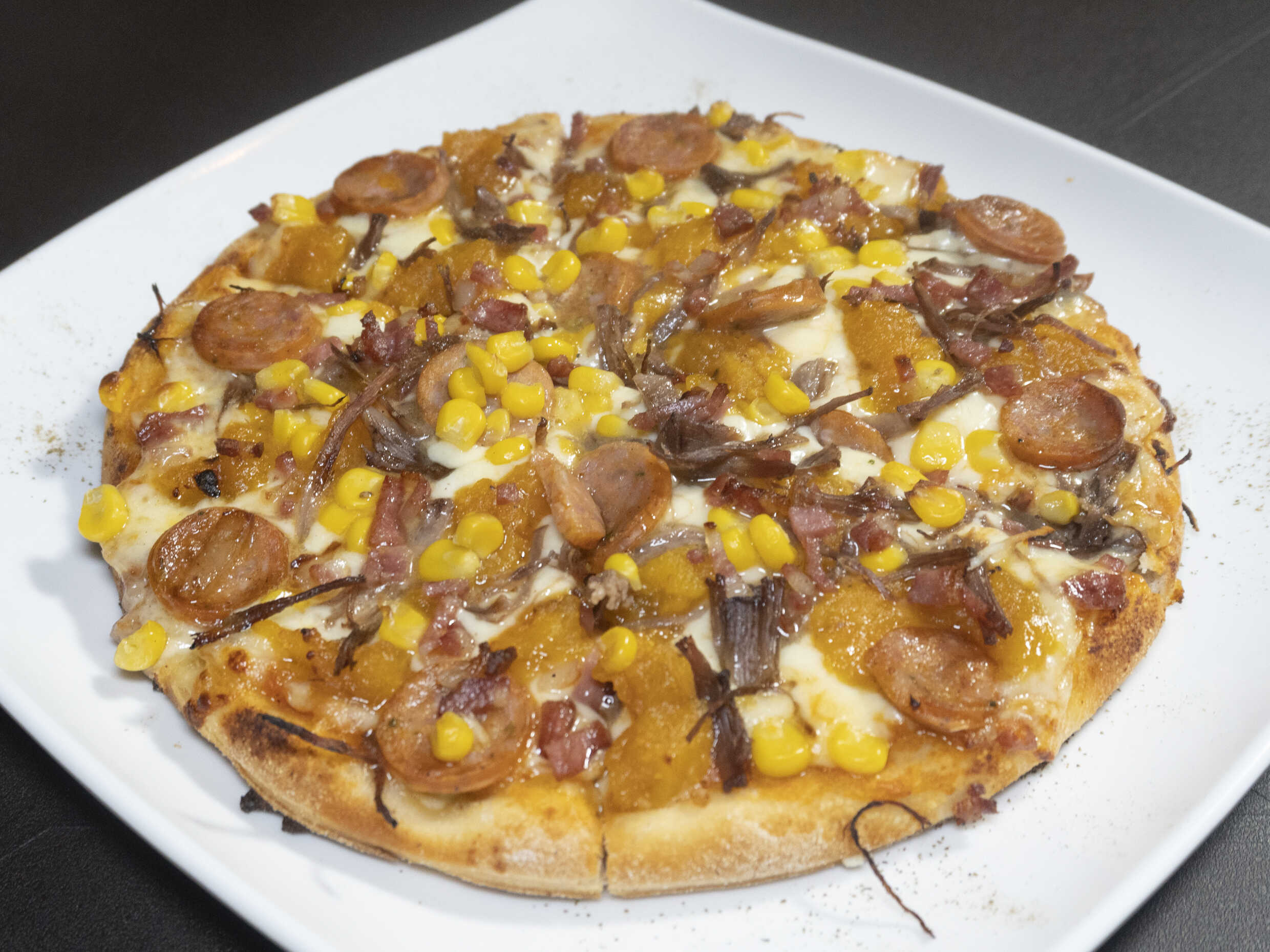 Pizza con carne desmechada, maduro, chorizo, maíz y tocineta, tamaño a elegir