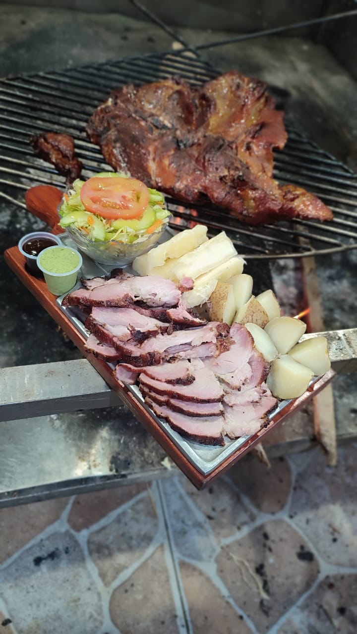 Carne a llanera 1800 g, acompañada de papa al vapor y ensalada, salsa BBQ y de la casa.