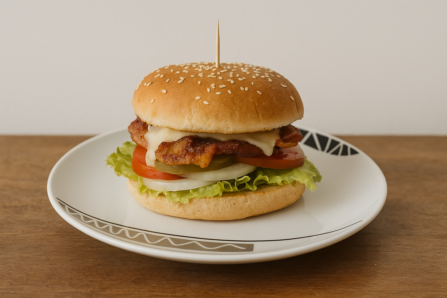 100 gr de carne llanera, pan, vegetales rescos (lechuga, tomate y cebolla), queso y salsas de la casa