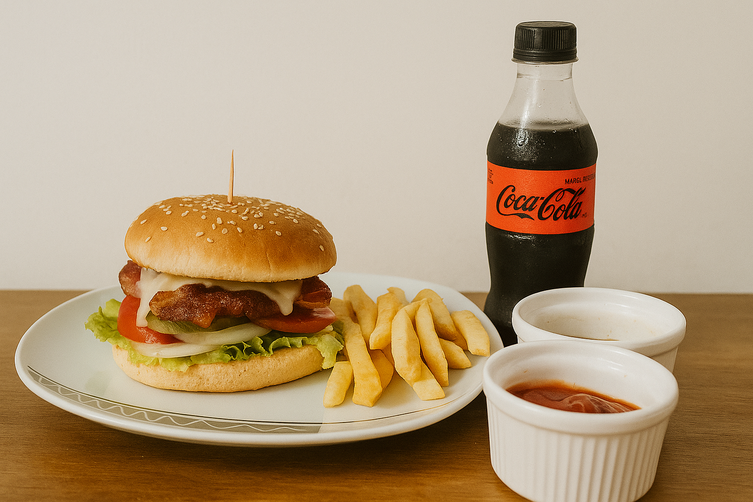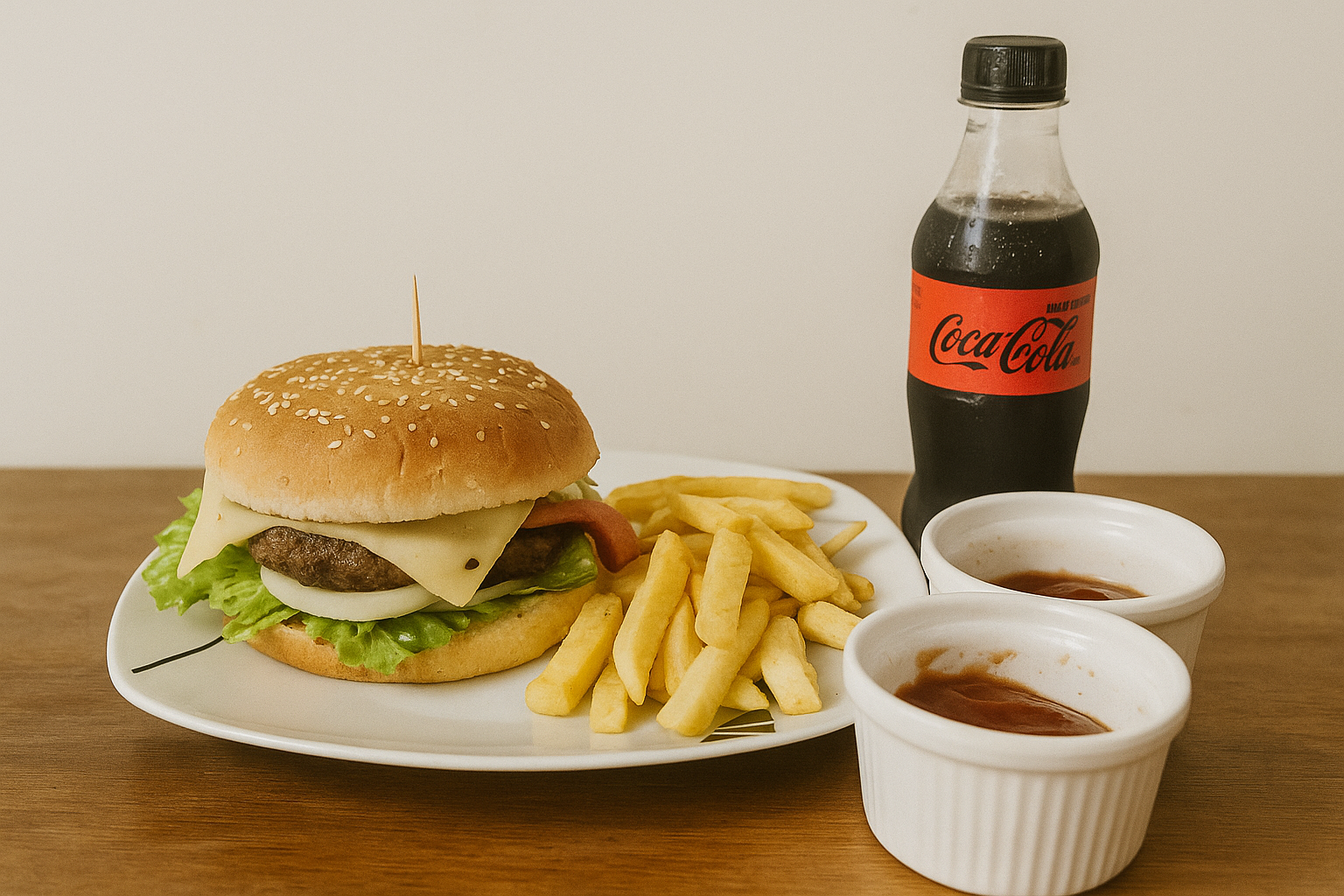 Hamburguesa Tradicional. (125 gr de carne, pan, vegetales rescos (lechuga, tomate y cebolla), queso y salsas de la casa)*1 + Papas a la francesa*1 + Gaseosa*1