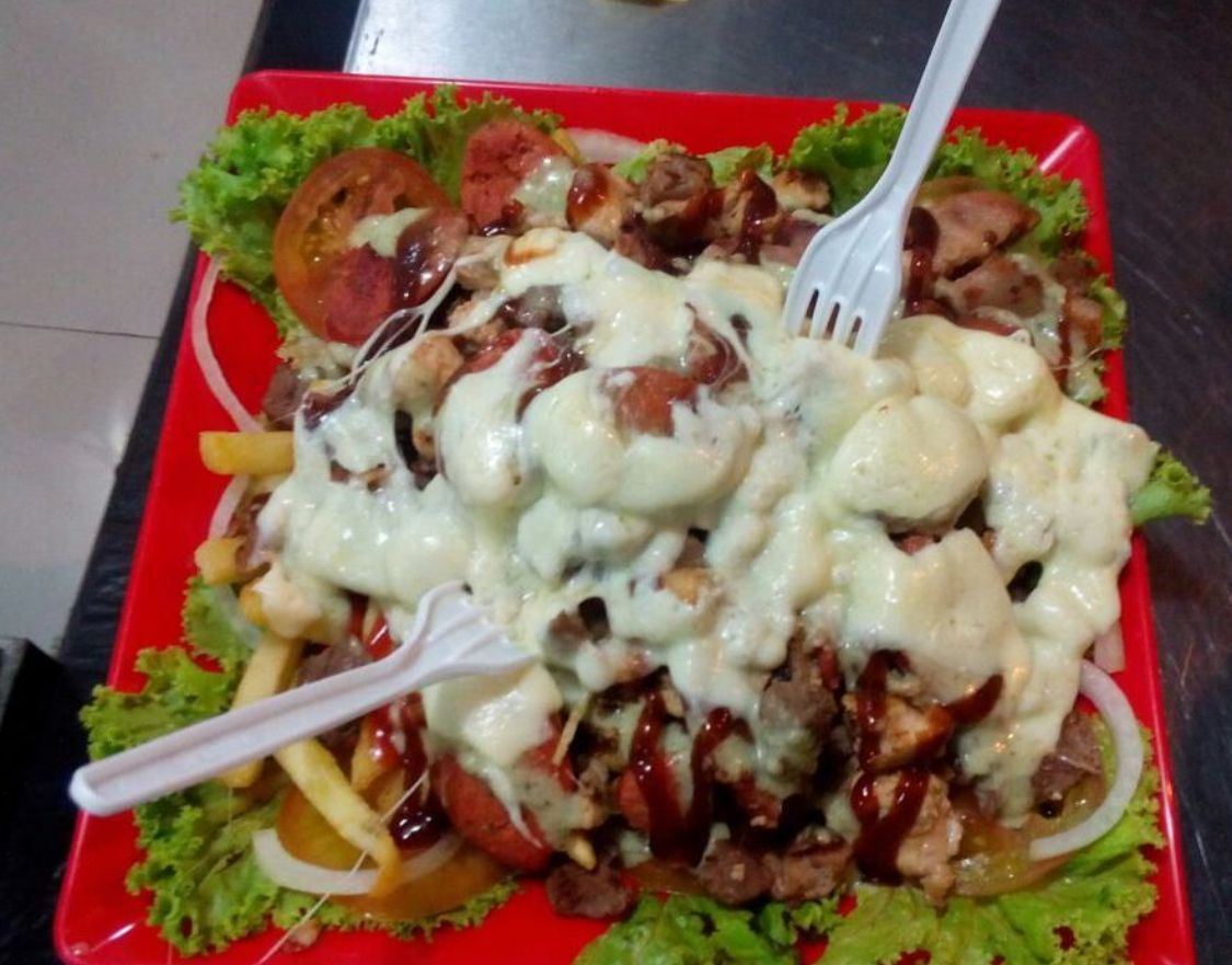 250grs de salchicha + 350grs de papas francesas +80grs tocineta + 200grs Carne Combinada + ripio de papas + cebolla sofrita + Maiz + Cuatro Queso