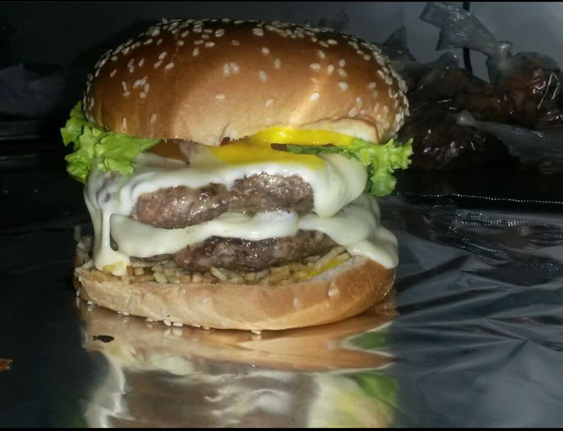 Doble carne un cuarto de libra, doble queso, ripio de papas, tomate, lechuga y cebolla.