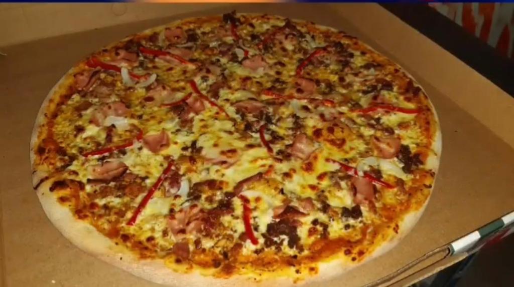8 Porciones. Ingredientes: cabano, tocineta, pollo, res, pimentón y cebolla.