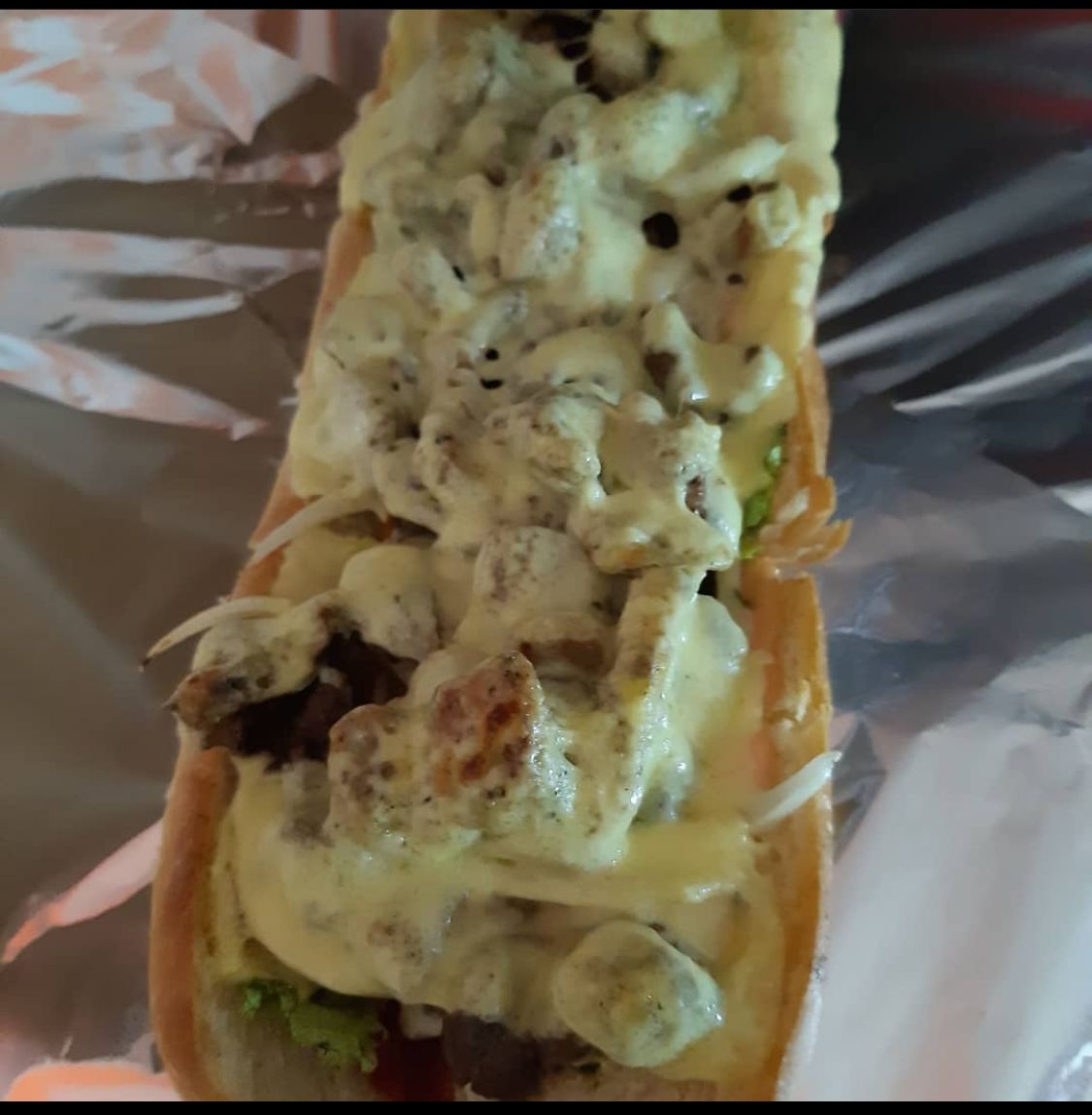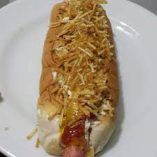 Salchicha americana, lechuga, cebolla, ripio de papas y doble queso.