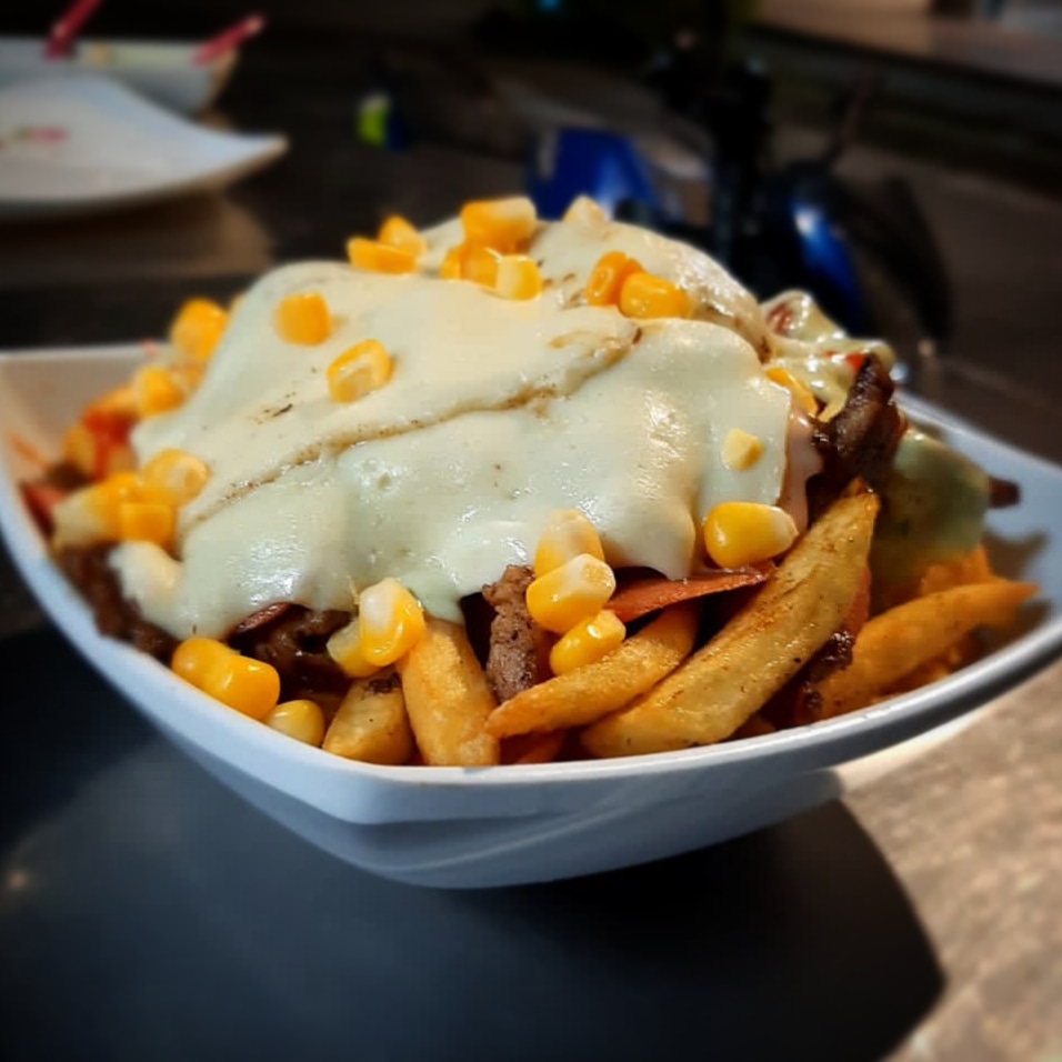200 g de papas francesas, maíz, 150 g de salchicha, 50 g de carne, 80 g de tocineta, cebolla sofrita, ripio de papas y triple queso.