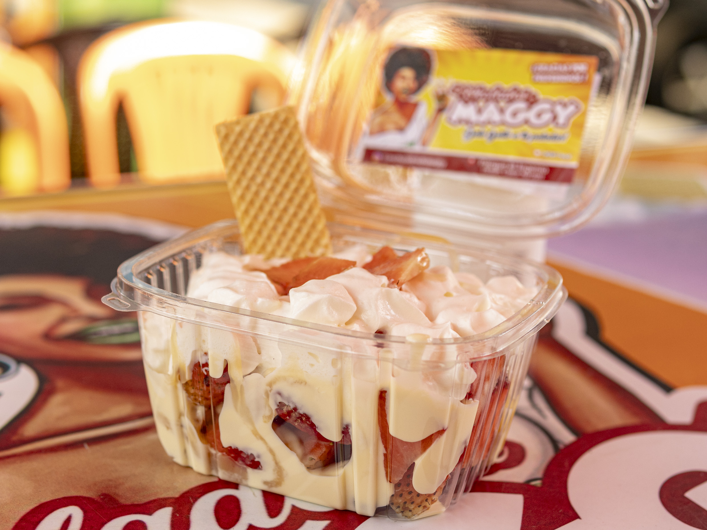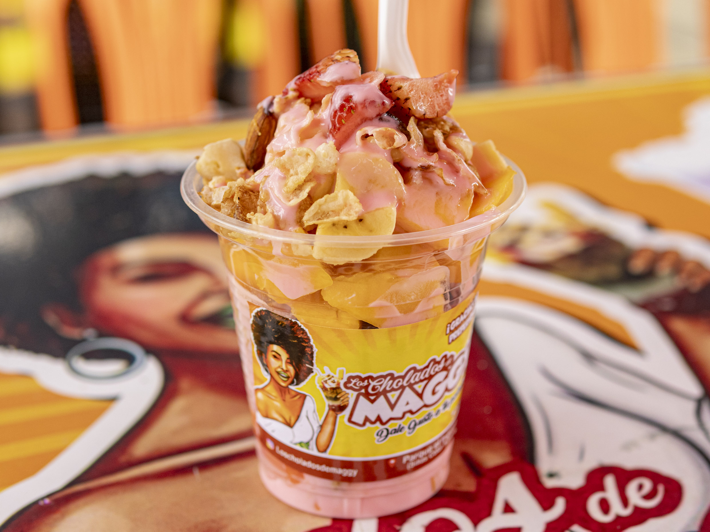 Papaya, banano, manzana verde, manzana roja, mango y fresa, yogurt, crema de leche, lechera, mermelada, cocada, queso y helado (sabor de helado sujeto a disponibilidad).