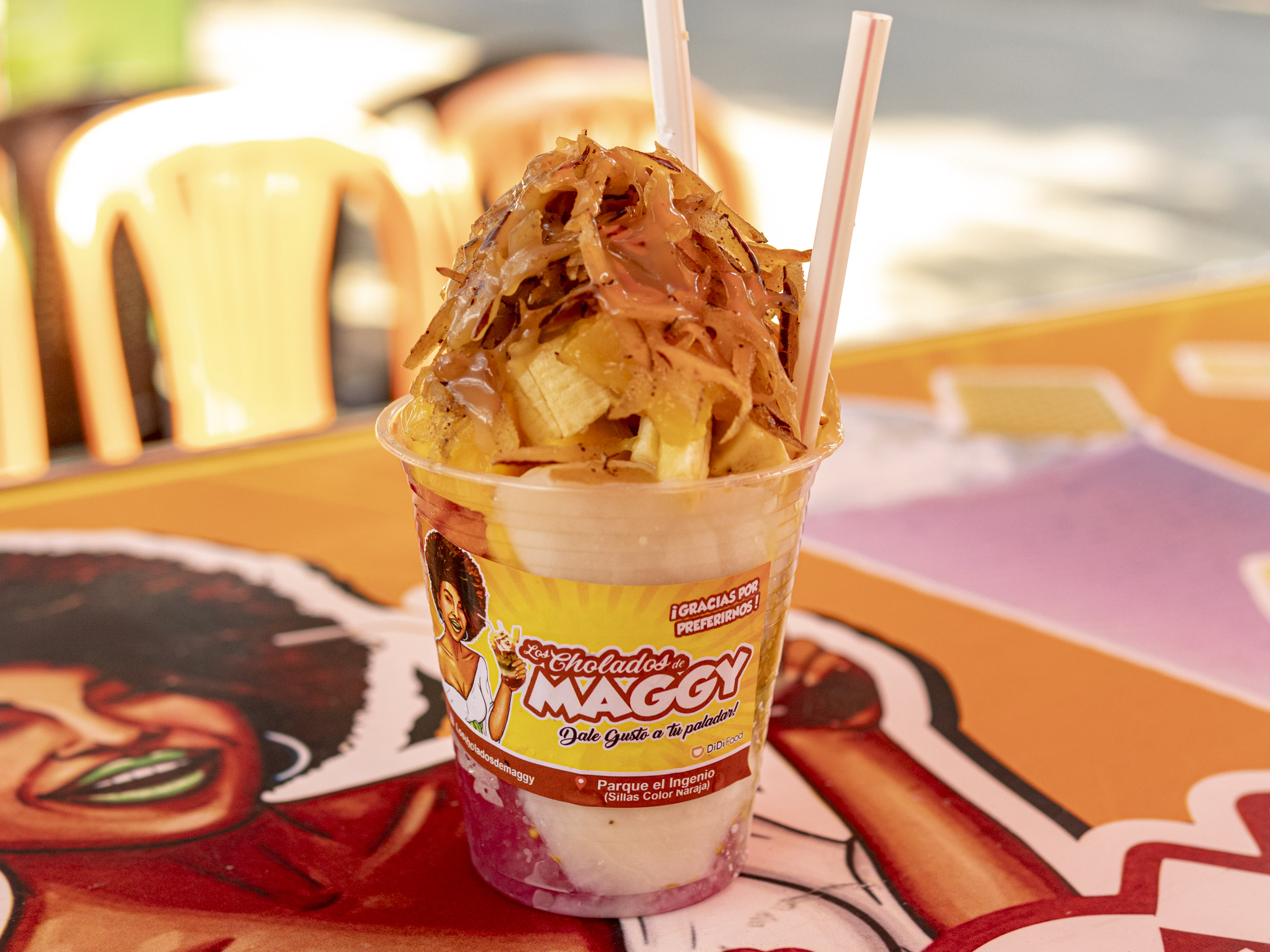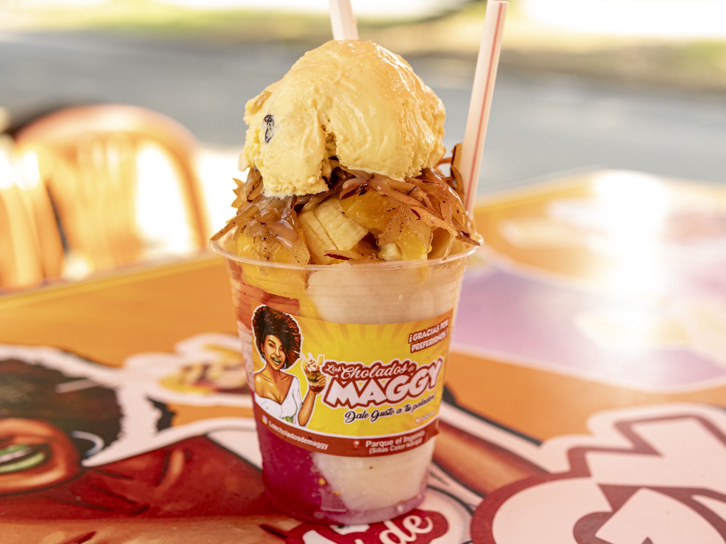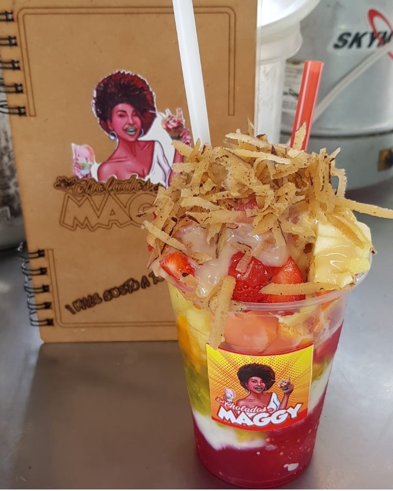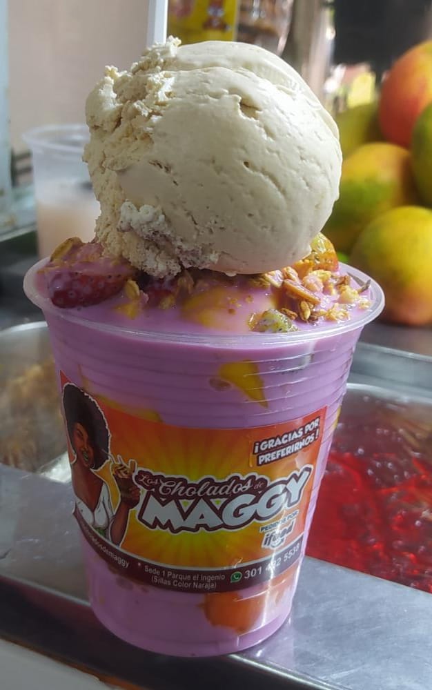 Frutas picadas (papaya, mango, piña, banano, guanábana, manzana, maracuyá), hielo raspado, anilina, leche condensada, coco rallado, salsa de mora y helado de vainilla.