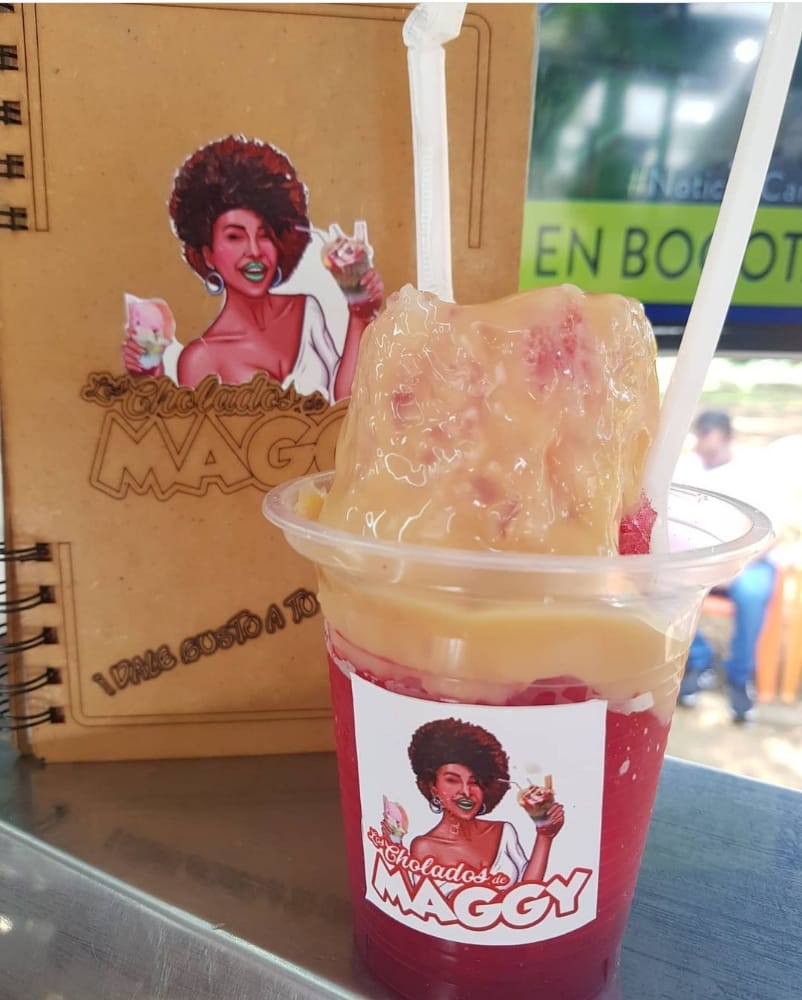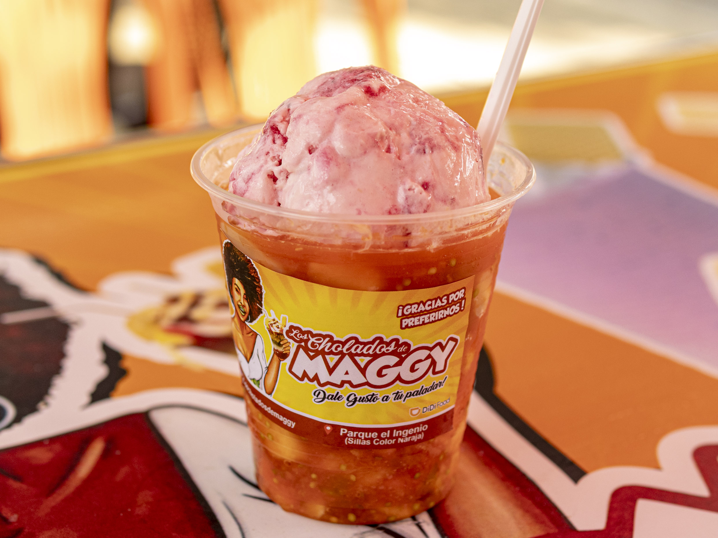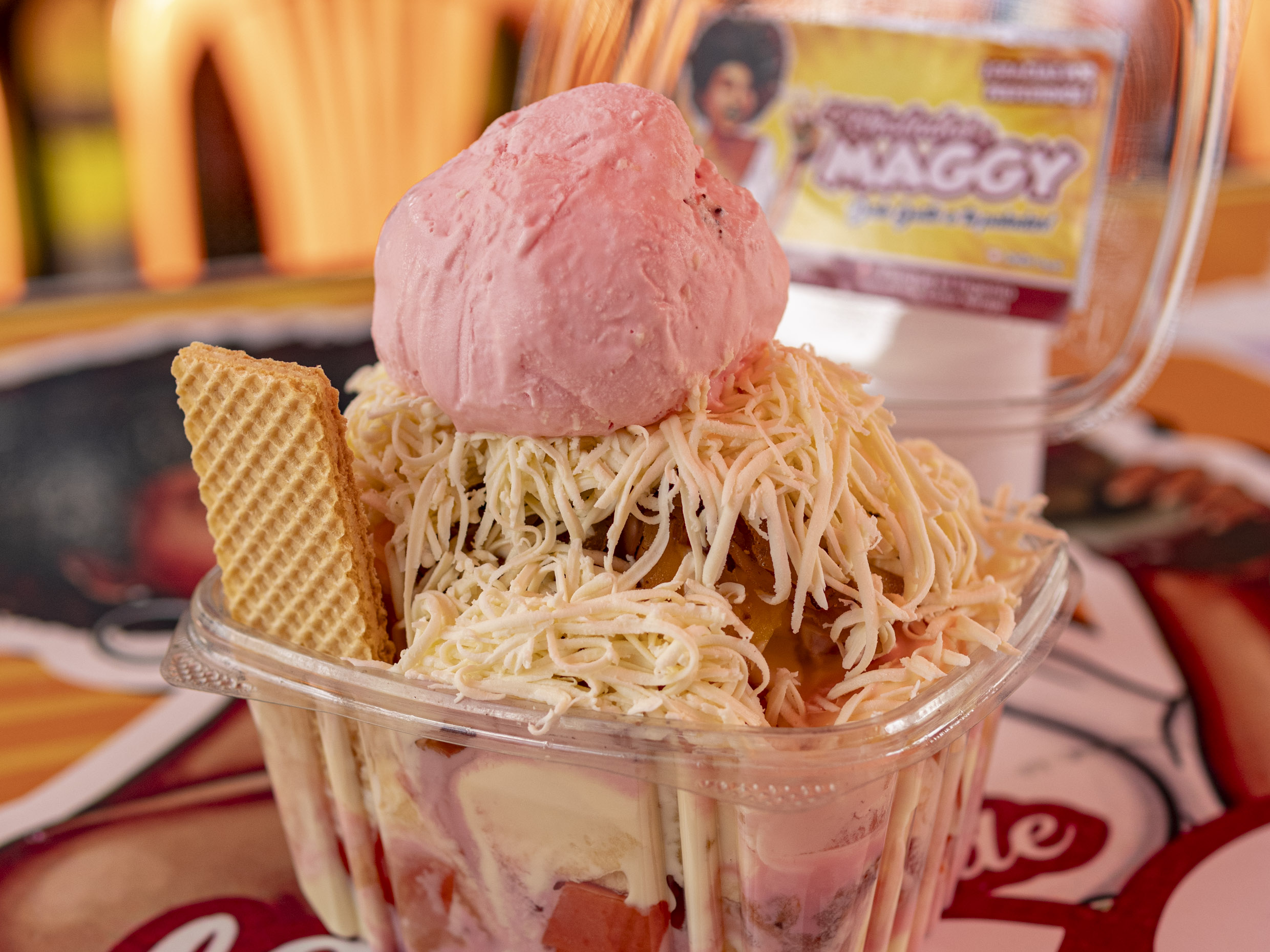 Frutas picadas (papaya, mango, piña, banano, guanábana, manzana, maracuyá), hielo raspado, anilina, leche condensada, coco rallado, salsa de mora y helado de vainilla.