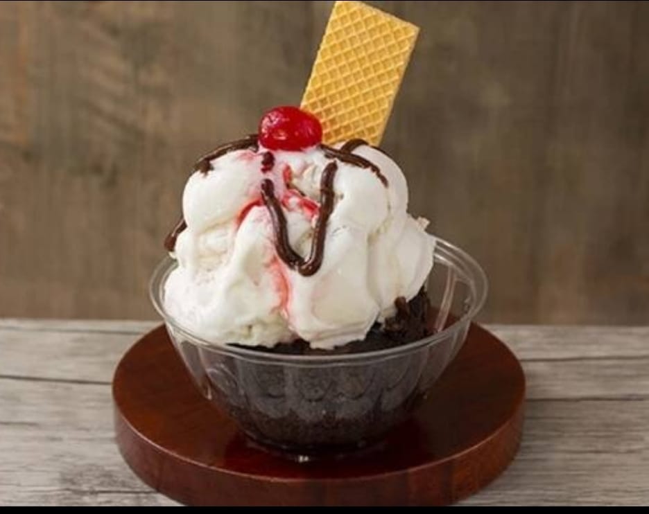 Brownie de chocolate, helado de vainilla, salsa de chocolate y galleta tipo waffer.