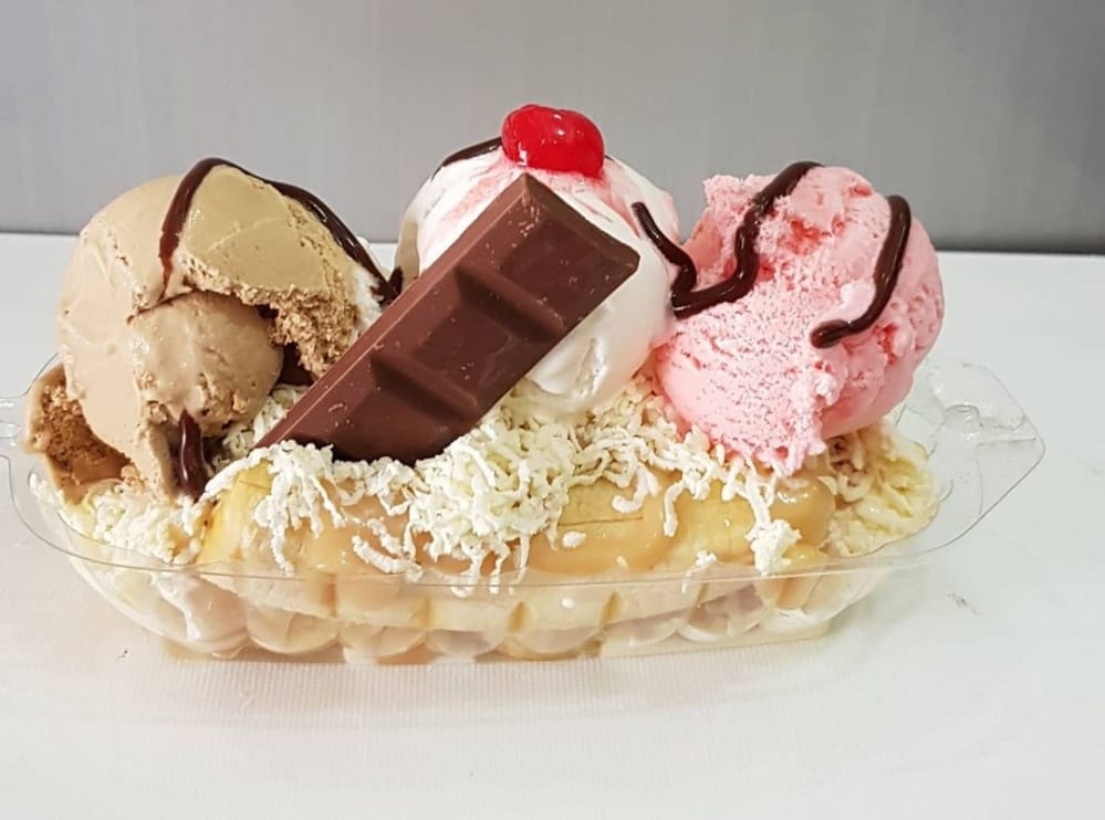 Banano, queso rallado ,Crema, Leche ,Lechera , pepitas de colores ,cereza ,salsa de chocolate