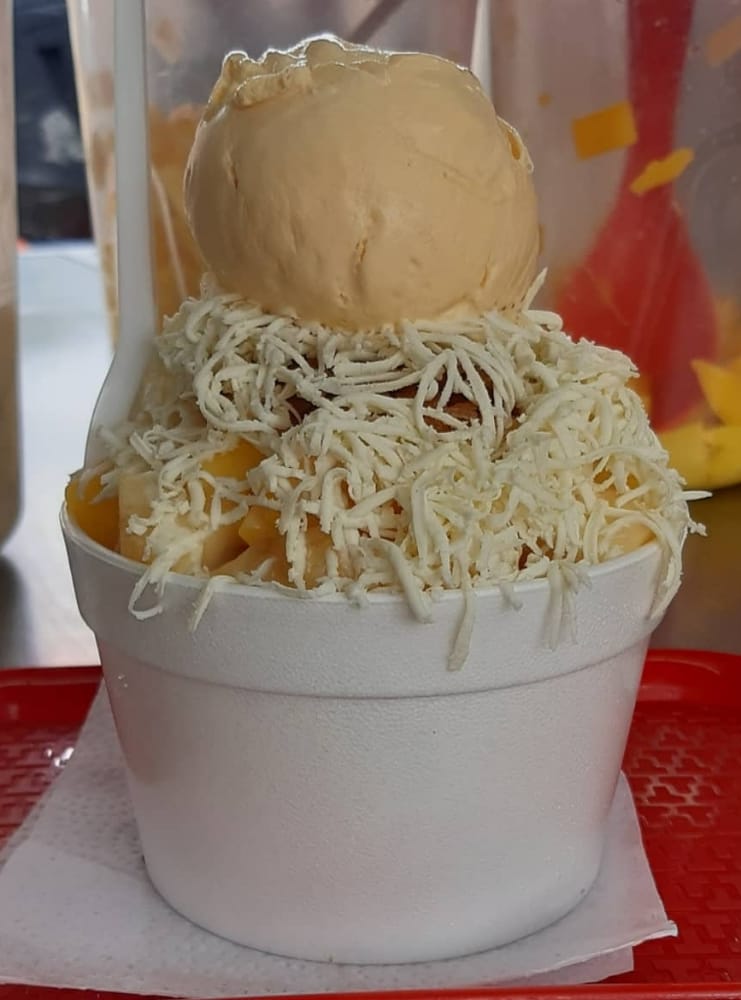 Salpicón de frutas (mango, papaya, banano, maracuyá, piña y manzana) con leche condensada y helado de vainilla.