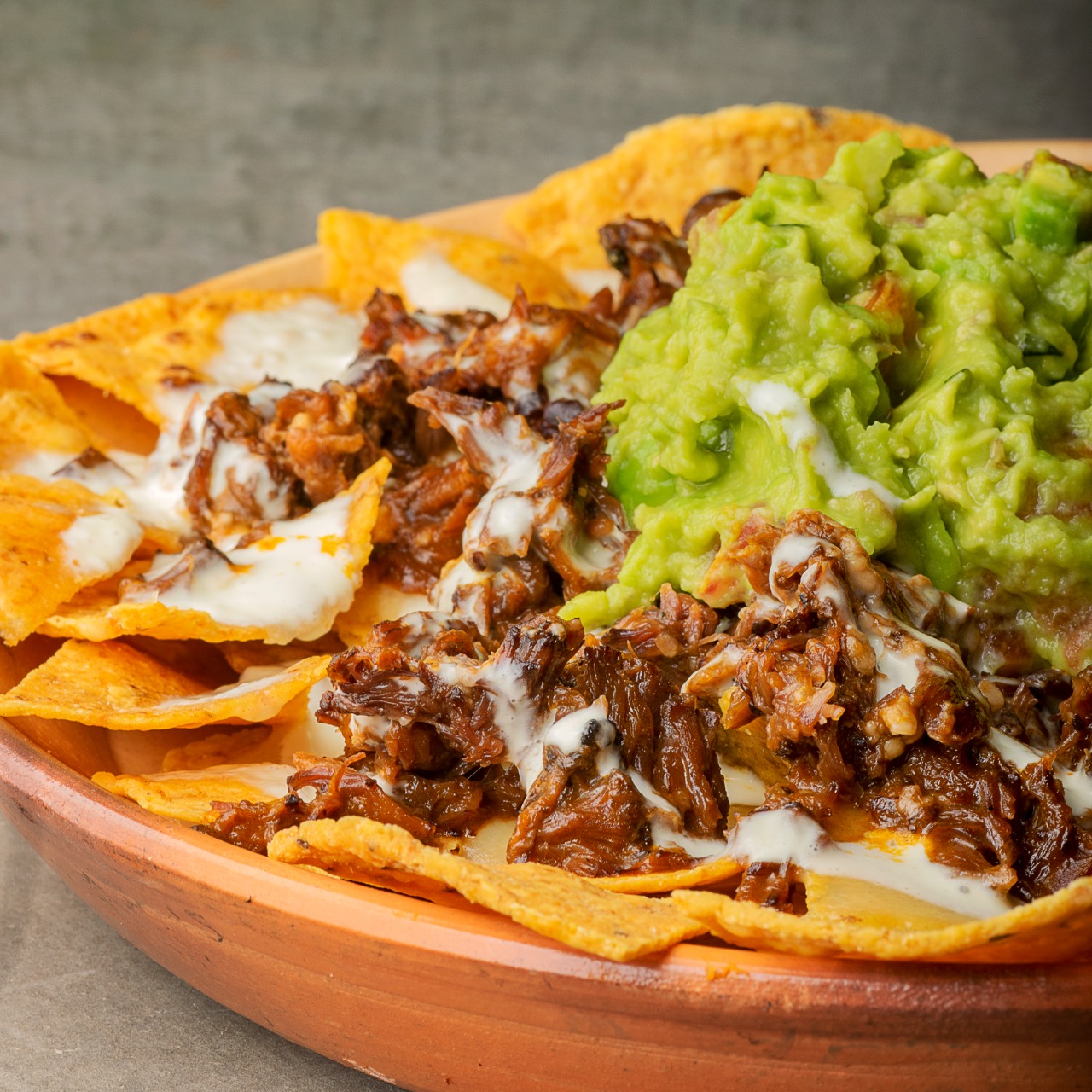 Entrada: Totopos con birria, queso fundido, sour cream y guacamole.
