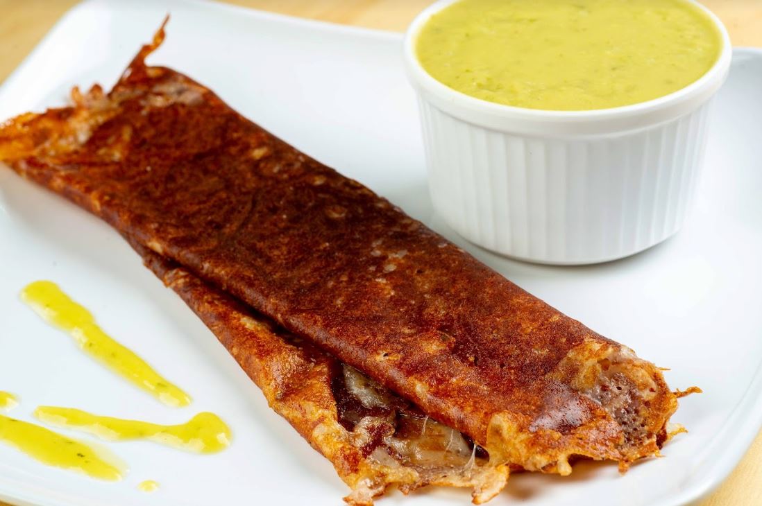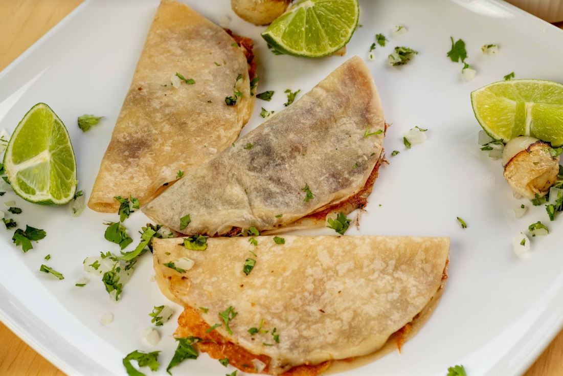Tortilla de harina con porción de queso fundido, proteína a elección, cebolla, cilantro y guacamole.