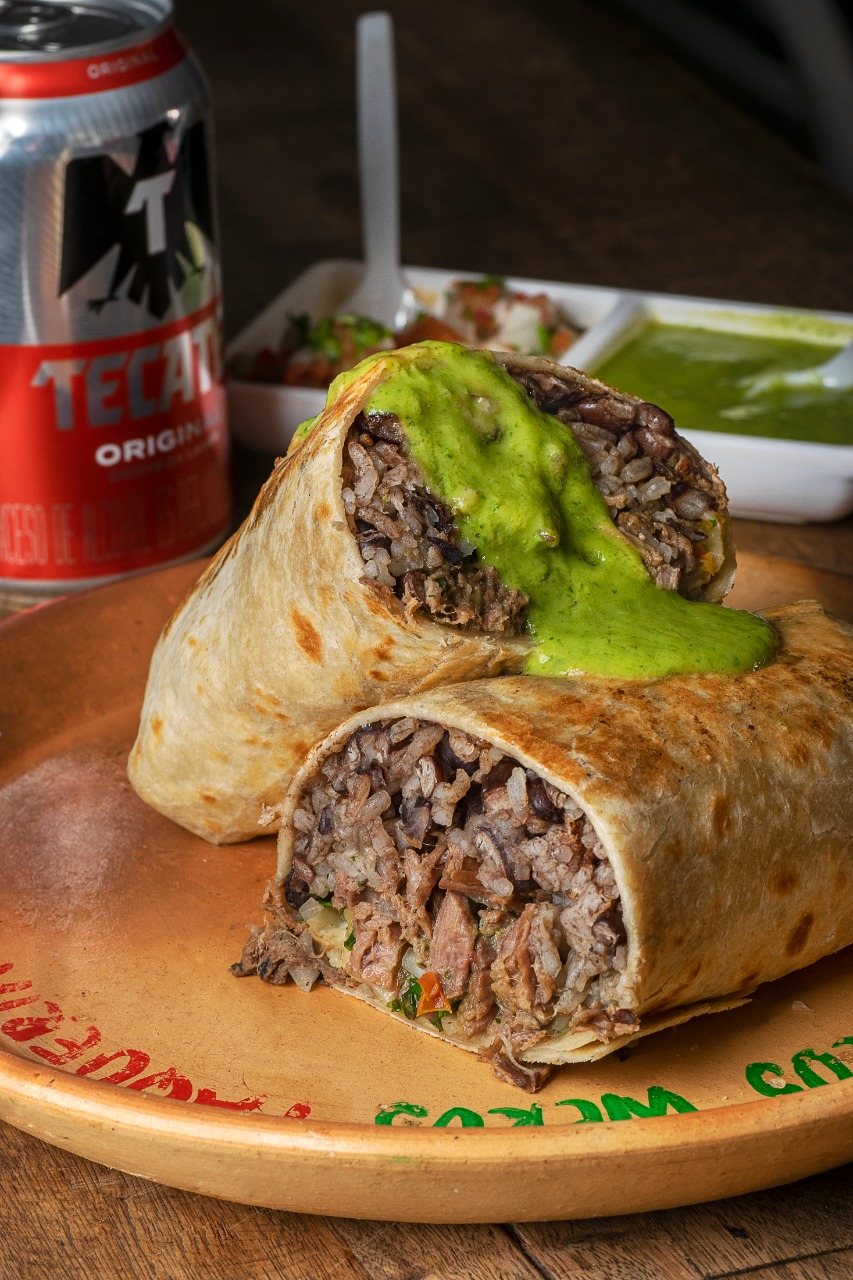 Tortilla de harina de 26 cm con proteína a elección, pico de gallo, frijol negro, arroz, pico de gallo y guacamole + bebida a elección
