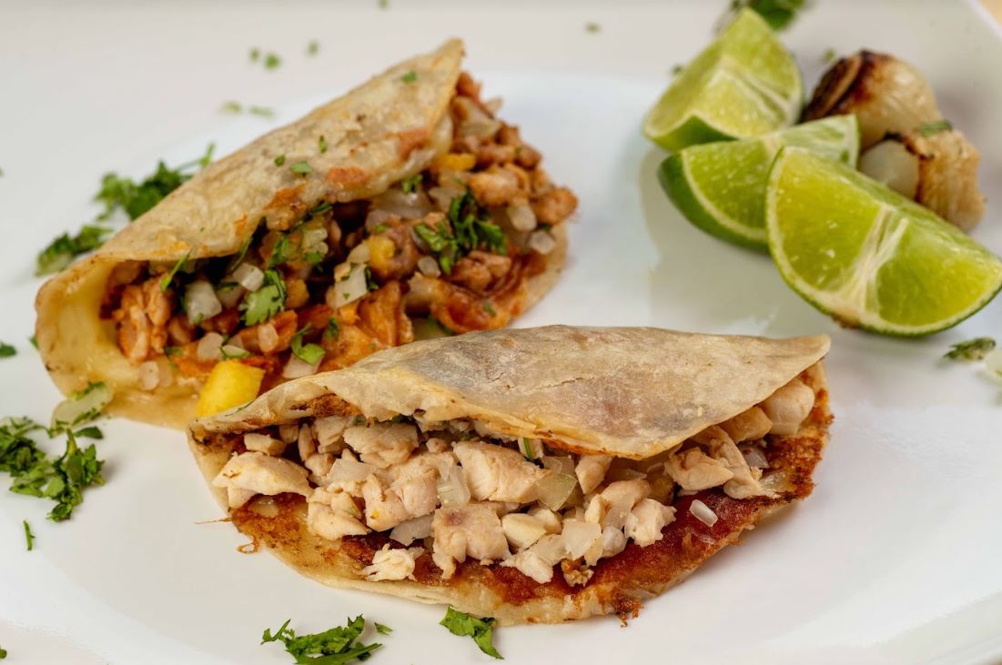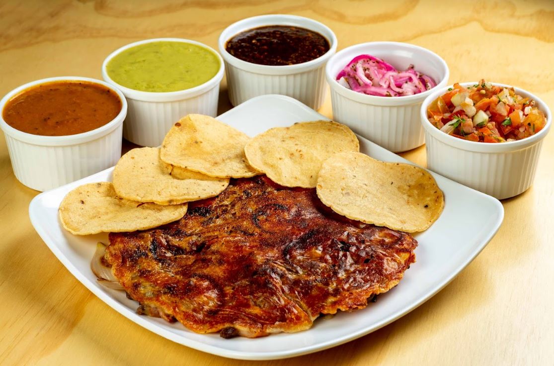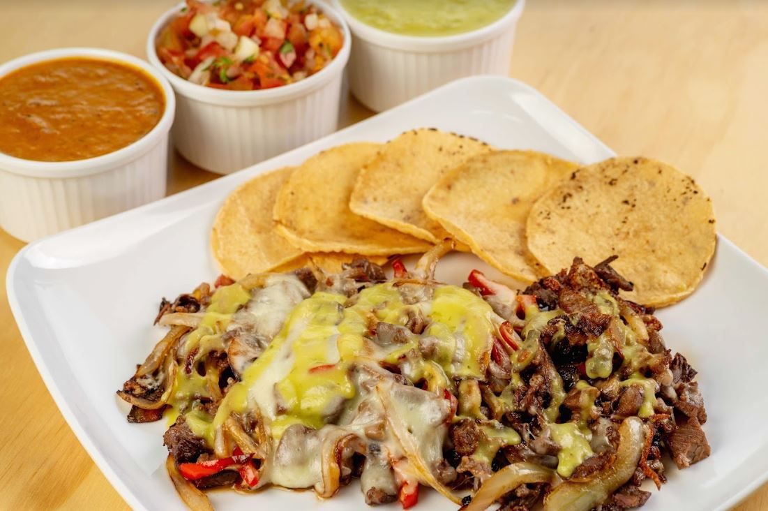 Combinación de vegetales frescos (cebolla y pimentón), proteína a elección, queso fundido y guacamole. Acompañado de 5 tortillas de maíz.