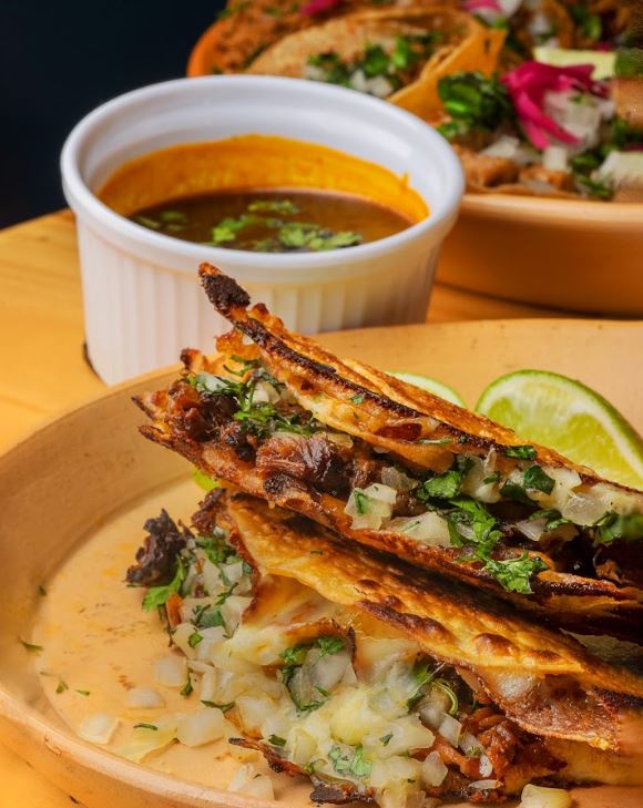 2 Tortillas de harina con porción de queso fundido, carne de birria de res acompañadas de su consomé, cebolla, cilantro y guacamole.