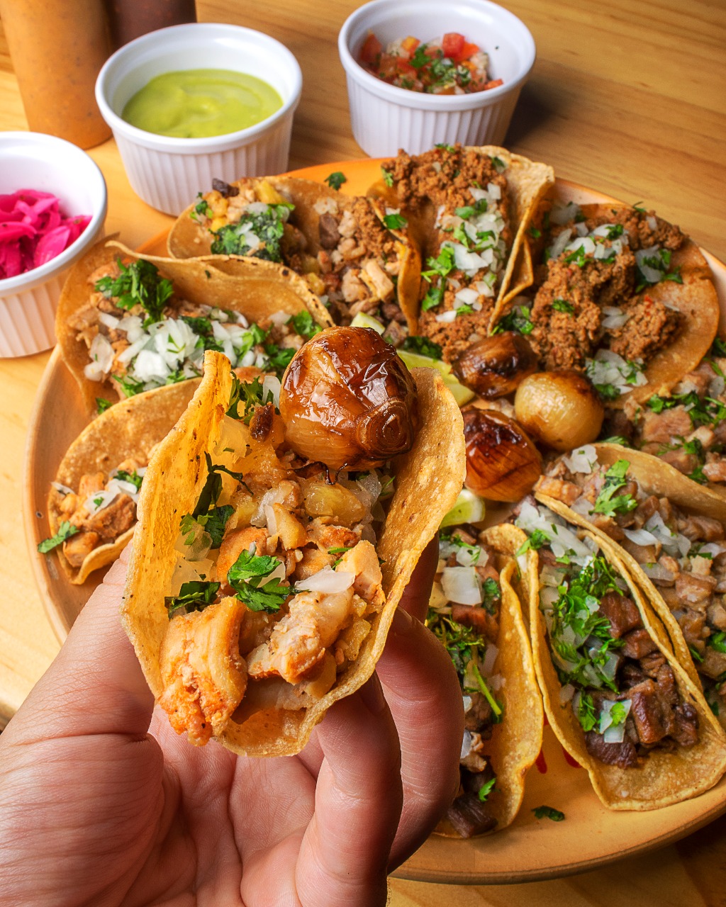 20 Tacos con proteína a elección, cebolla, cilantro y guacamole.