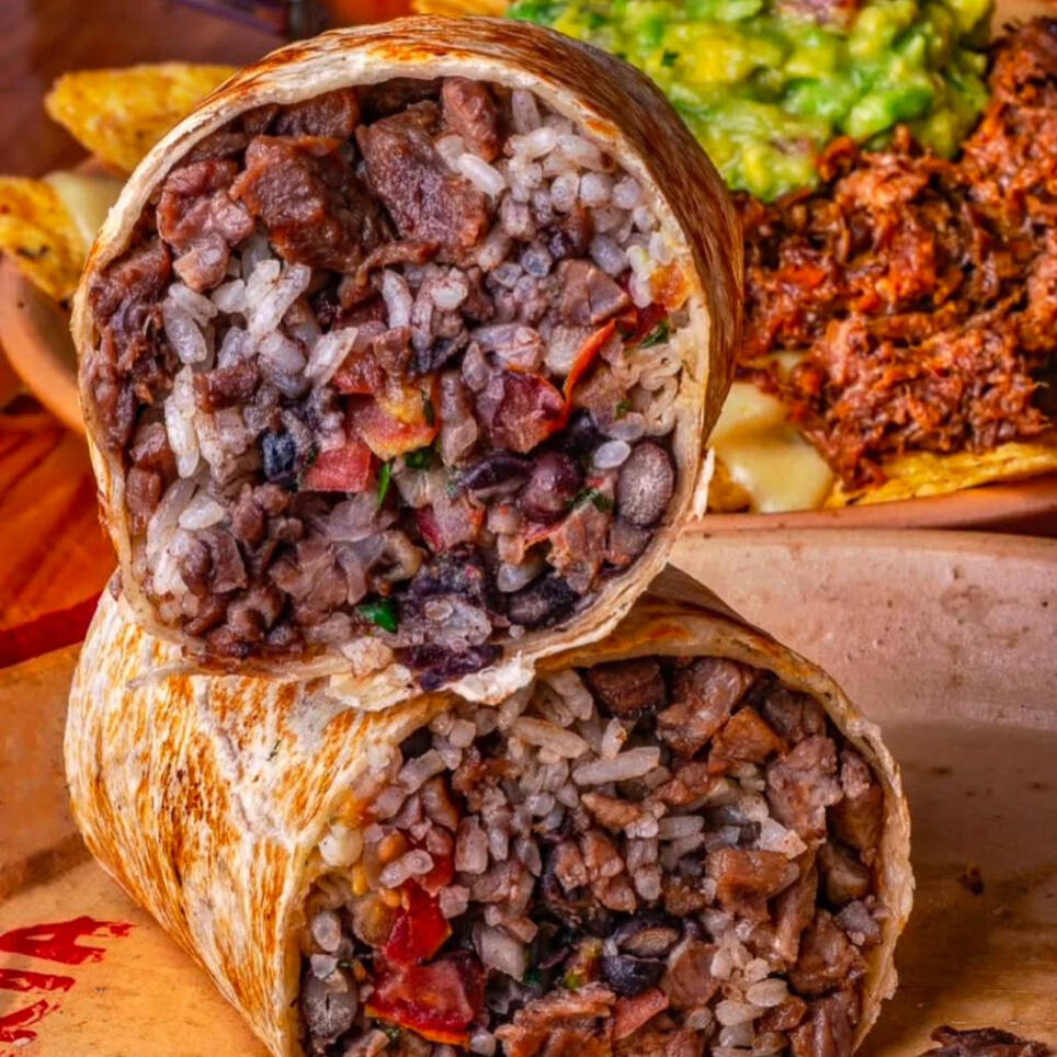 2 Burritos medianos (Tortilla de harina con proteína a elección, pico de gallo, frijol negro, arroz, pico de gallo y guacamole)