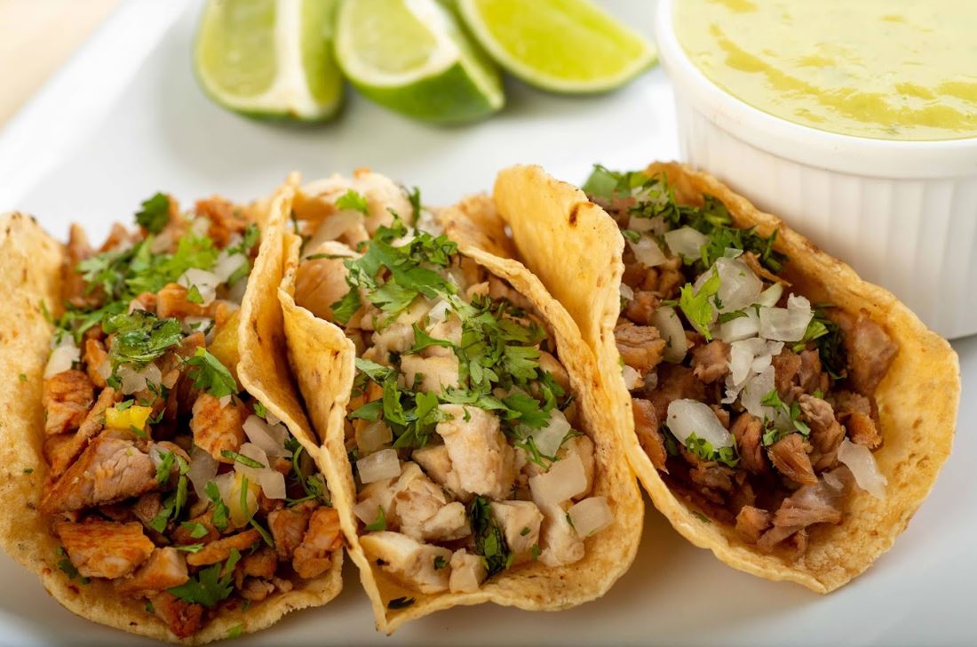 Tacos con proteína a elección, cebolla, cilantro y guacamole.