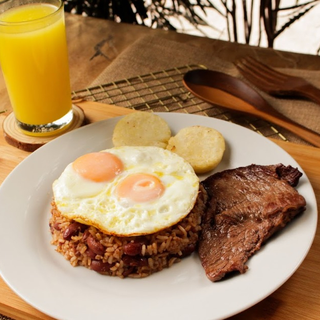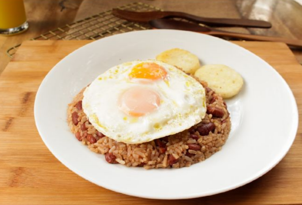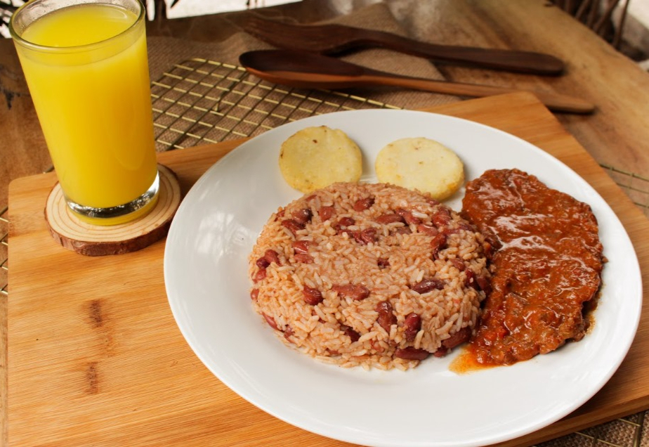 Delicioso bistec a caballo acompañado de arroz y arepa.