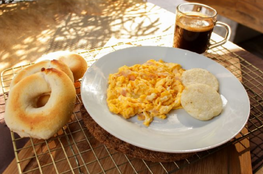 Huevos acompañados de Ranchera, jamón, champiñones, queso mozzarella, arepa o rodajas de pan.