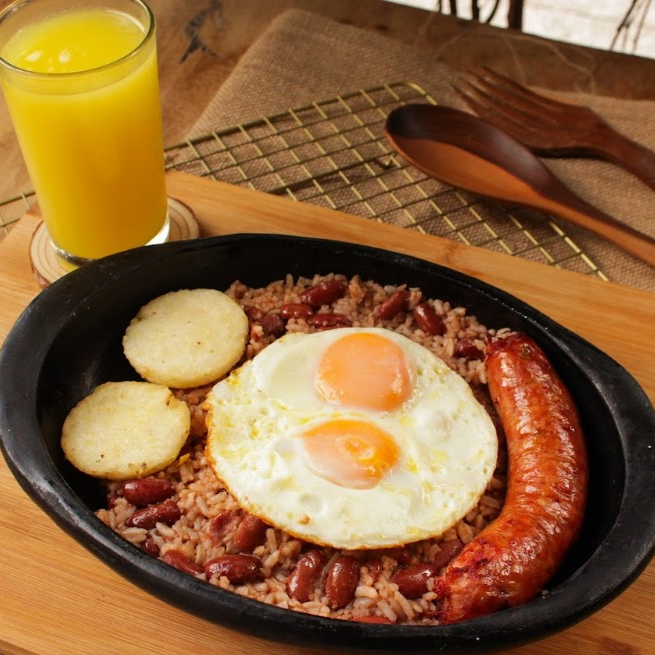 Delicioso calentado de frijoles acompañado de delicioso chorizo madero, huevos en cacerola, arepa.