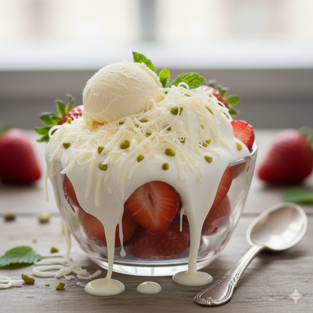 Fresas frescas seleccionadas bañadas en nuestra crema especial de la casa. y un sabor de helado