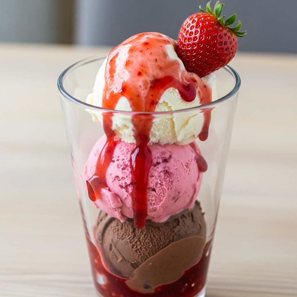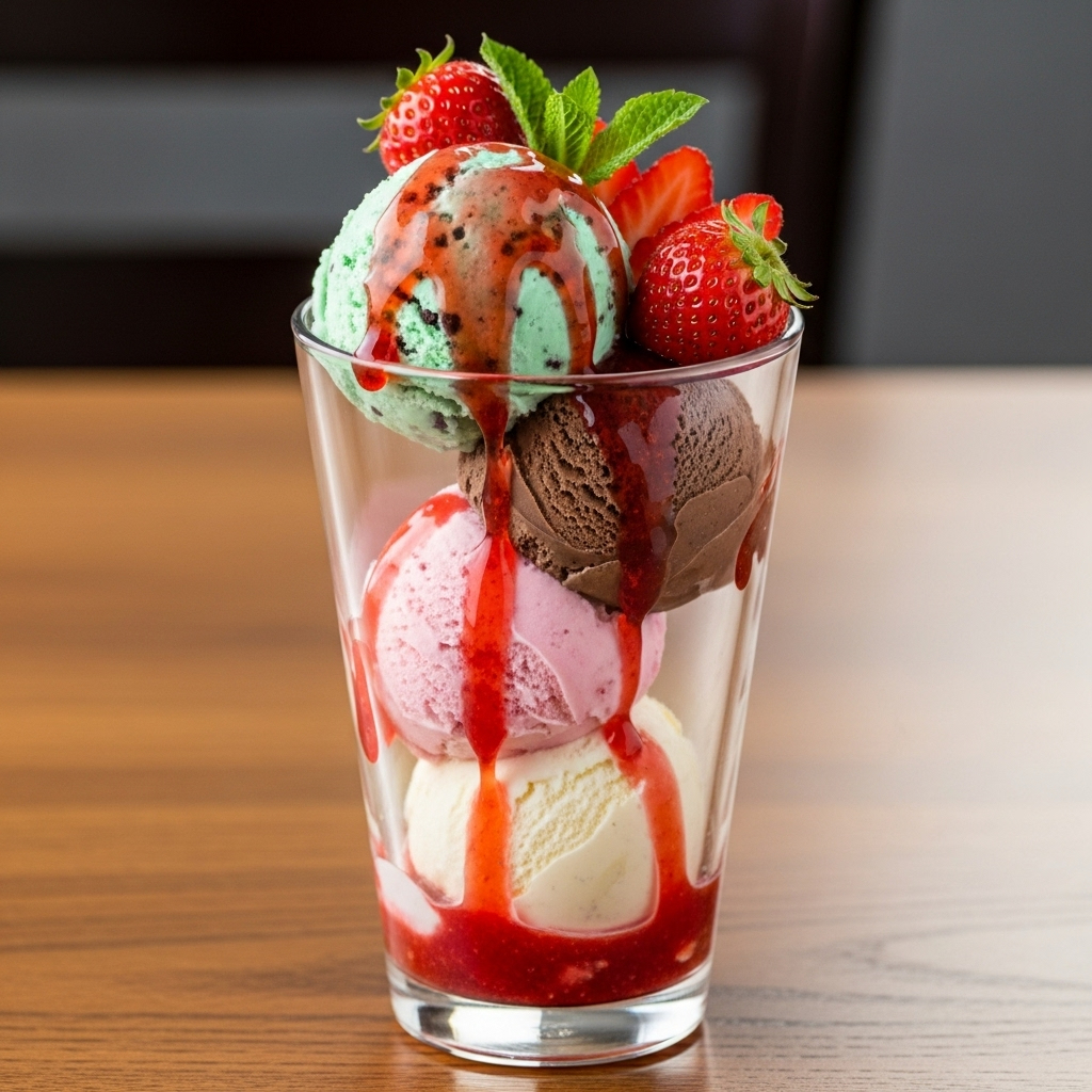 El clásico renovado: 3 sabores de helados acompañados de abanico, banano y nuestra deliciosa salsa dulce de la casa