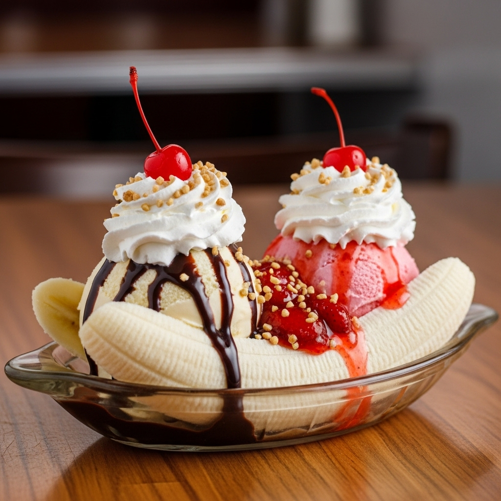 El clásico renovado: 2 sabores de helados acompañados de abanico, banano y nuestra deliciosa salsa dulce de la casa.