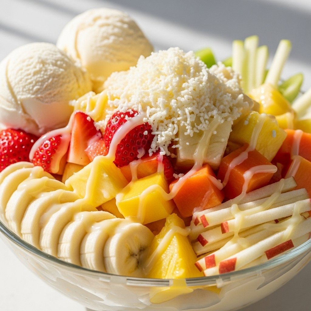 Banano, fresa, mango, piña, papaya, manzana, bañada en crema de leche, lecherita y una generosa capa de queso rallado, 2 bolas de helado a eleccion.